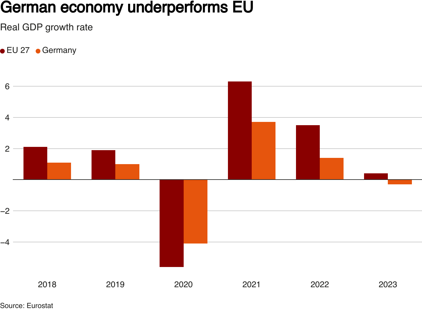 自2018年以来德国经济表现不佳于欧盟