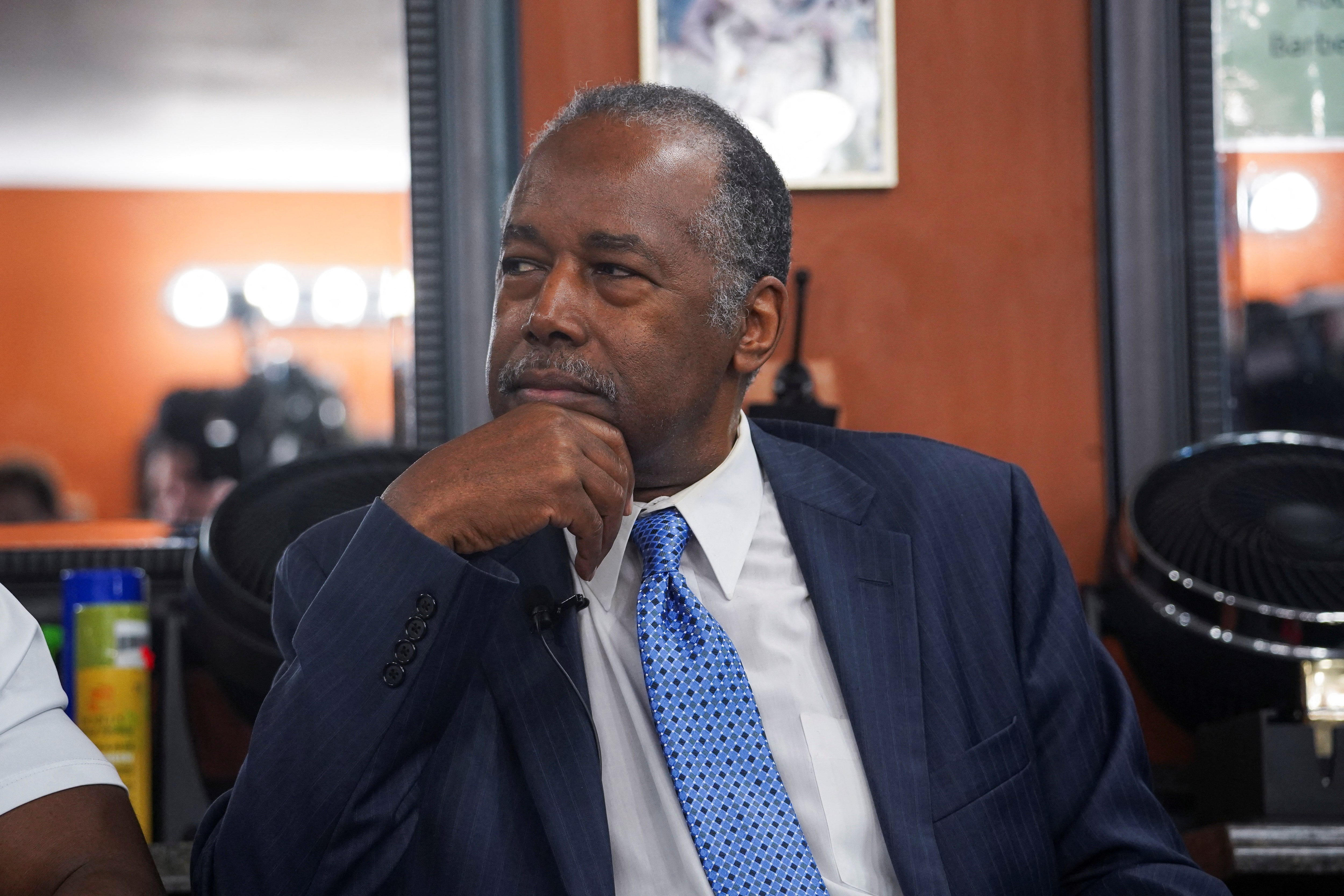 项目 1 共 3 博士本·卡森作为共和党总统候选人,前美国总统唐纳德·特朗普在他为“黑人美国商业领袖理发店圆桌会议”主办的竞选活动中打电话,地点在乔治亚州亚特兰大的罗基理发店,时间为2024年6月26日。路透社/梅根·瓦尔纳/档案照片