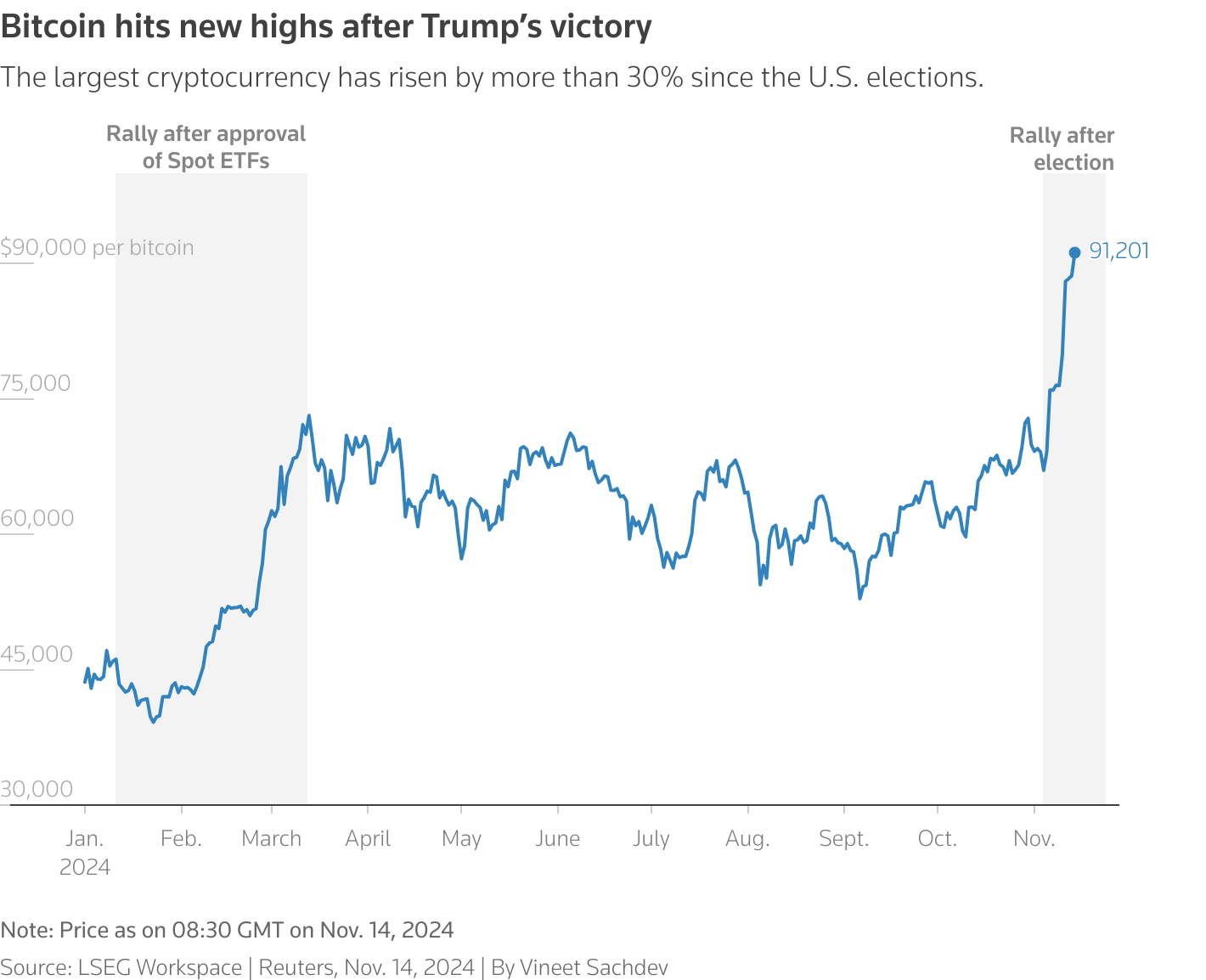 自美国选举以来,最大的加密货币价值已上涨超过30%,并徘徊在91,000美元以上。