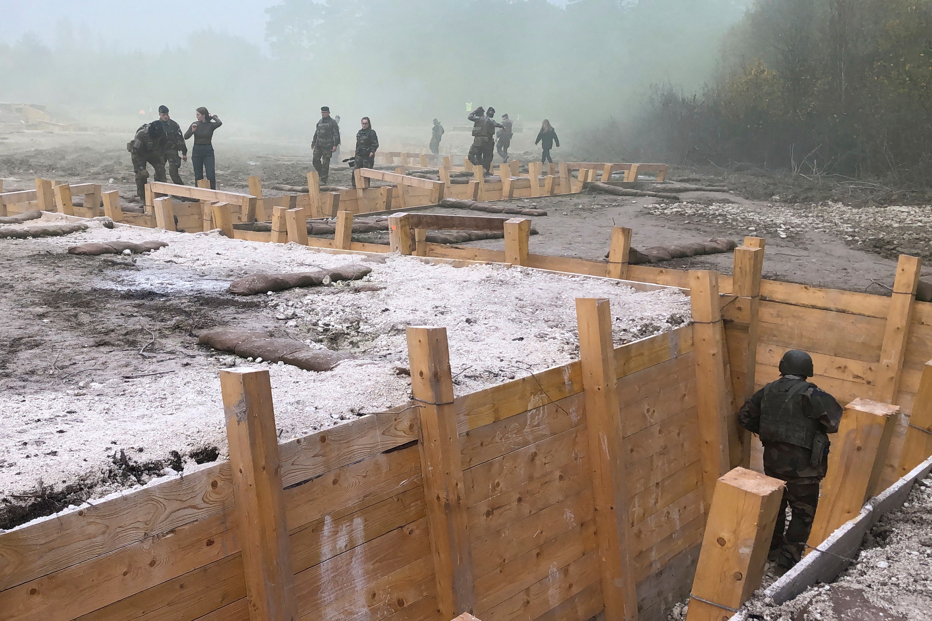 这个场景可能在距离3,000公里(1,860英里)远的乌克兰顿巴斯地区,但实际上约2,000名乌克兰征兵和退伍军人在法国东部的马恩地区的泥泞田野中训练,这里曾是法国和德国军队在第一次世界大战中互相激战的地方。