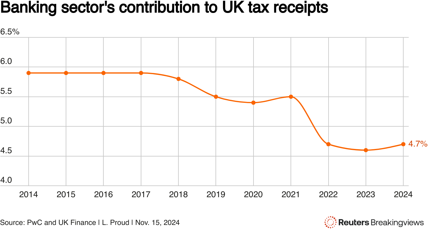问题在于,任何对行业有意义的措施,比如放宽银行资本规则或其他监管措施,都可能增加金融危机的风险。前工党财政部长戈登·布朗在2008年发现了这一点,当时多年的轻监管促使了一波救助和随后的衰退。放松监管可以说为政府带来了税收利益,但数字并不大:根据普华永道为英国金融游说团体的研究,银行贡献的总收入不到5%。