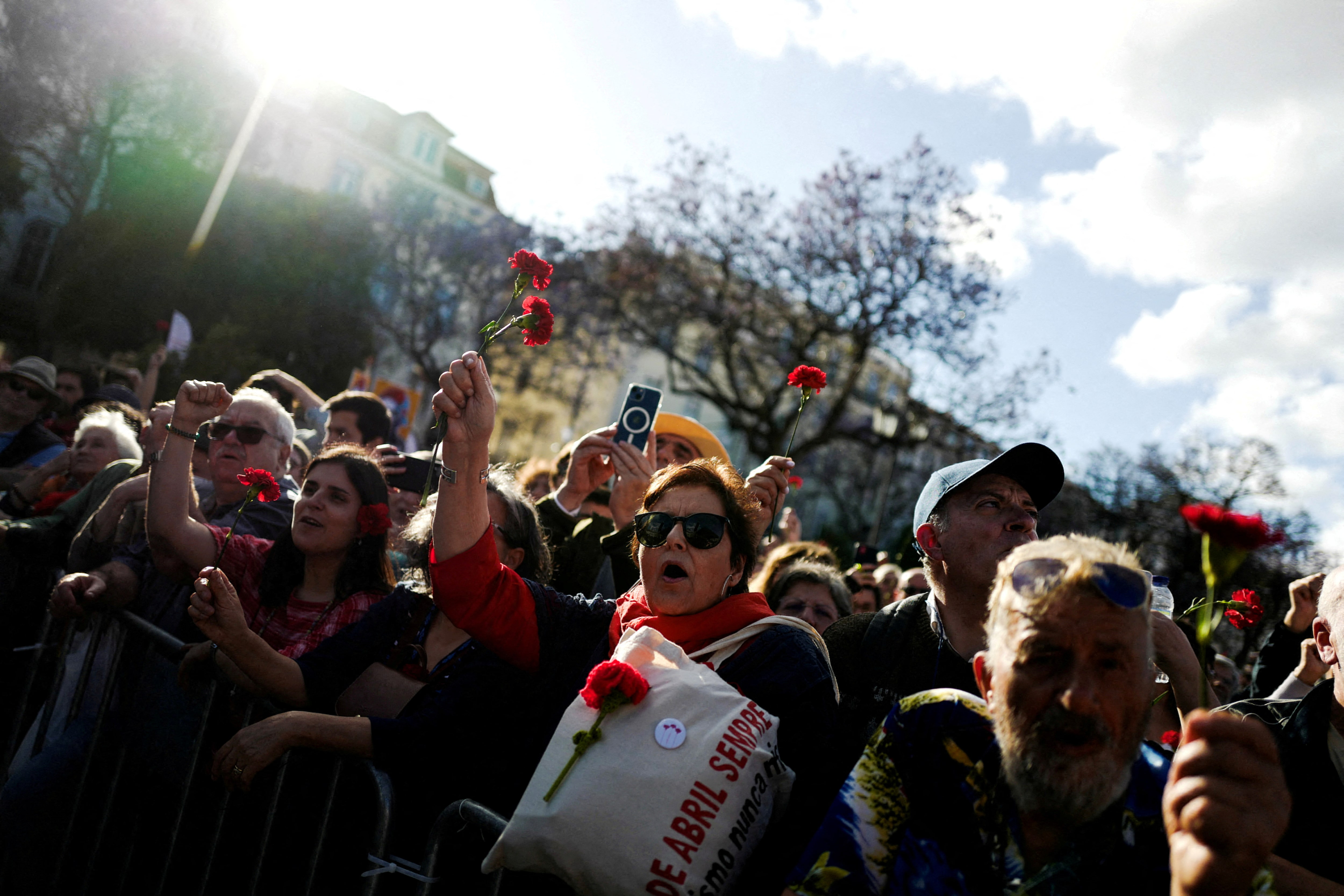 人们在葡萄牙里斯本庆祝葡萄牙康乃馨革命50周年的纪念活动中高喊口号,该革命导致了独裁政权的推翻和民主的过渡,时间是2024年4月25日。路透社/佩德罗·努内斯/档案照片里斯本,11月15日(路透社) - 葡萄牙女性塞莱斯特·凯罗(Celeste Caeiro)在1974年被称为康乃馨革命的政变中向反抗法西斯独裁的士兵们分发康乃馨,周五去世,享年91岁。