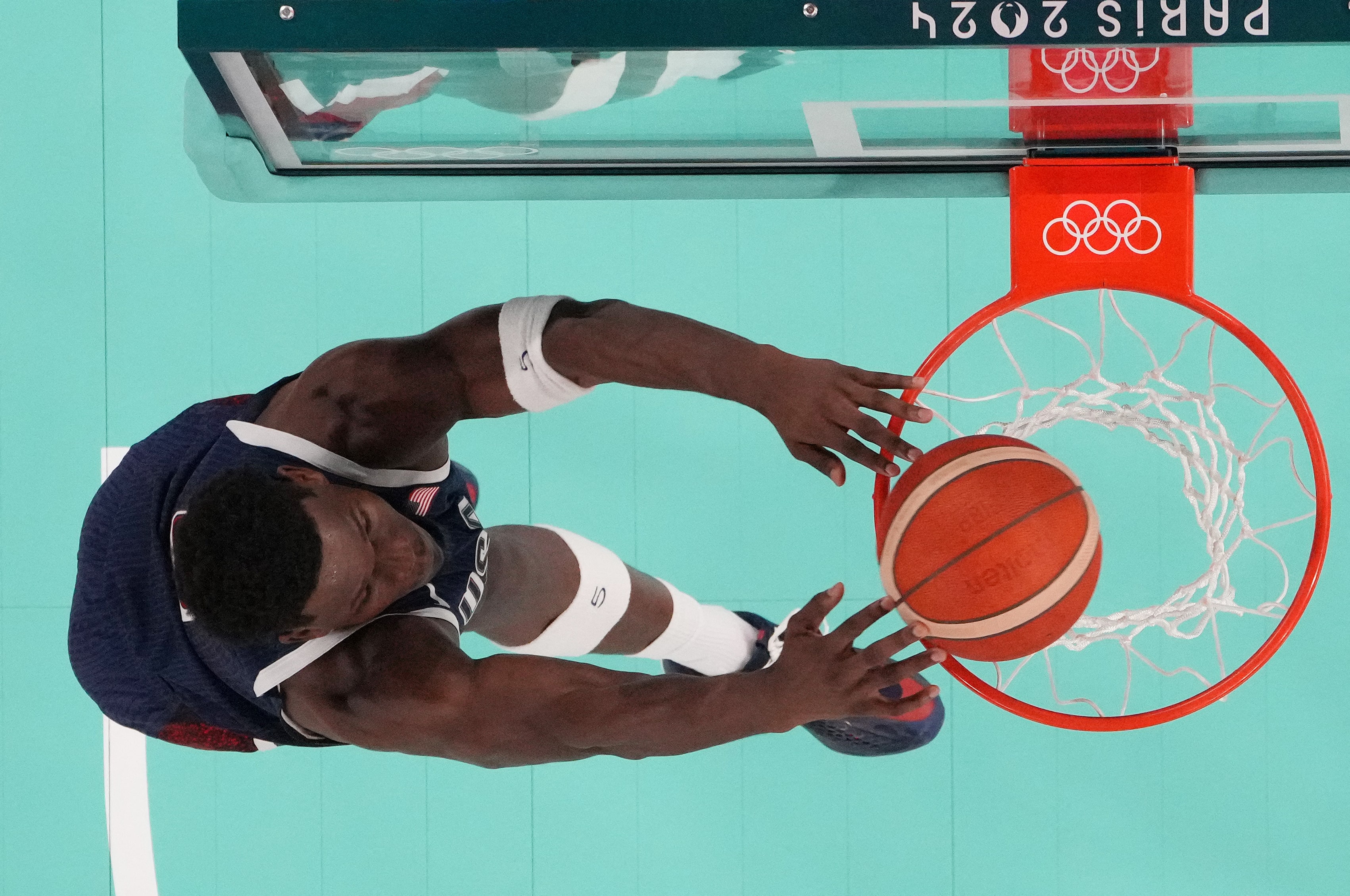美国球员安东尼·爱德华兹在2024年8月10日法国巴黎奥运会上进球时的瞬间。摄影:伊夫琳·霍克斯坦 - 路透社11月16日(阿拉伯路透社体育服务) - 安东尼·爱德华兹在加时赛中得到36分中的7分,带领明尼苏达森林狼以130-126战胜萨克拉门托国王,后者的迪阿龙·福克斯则得到了60分,比赛在NBA联赛杯中进行。