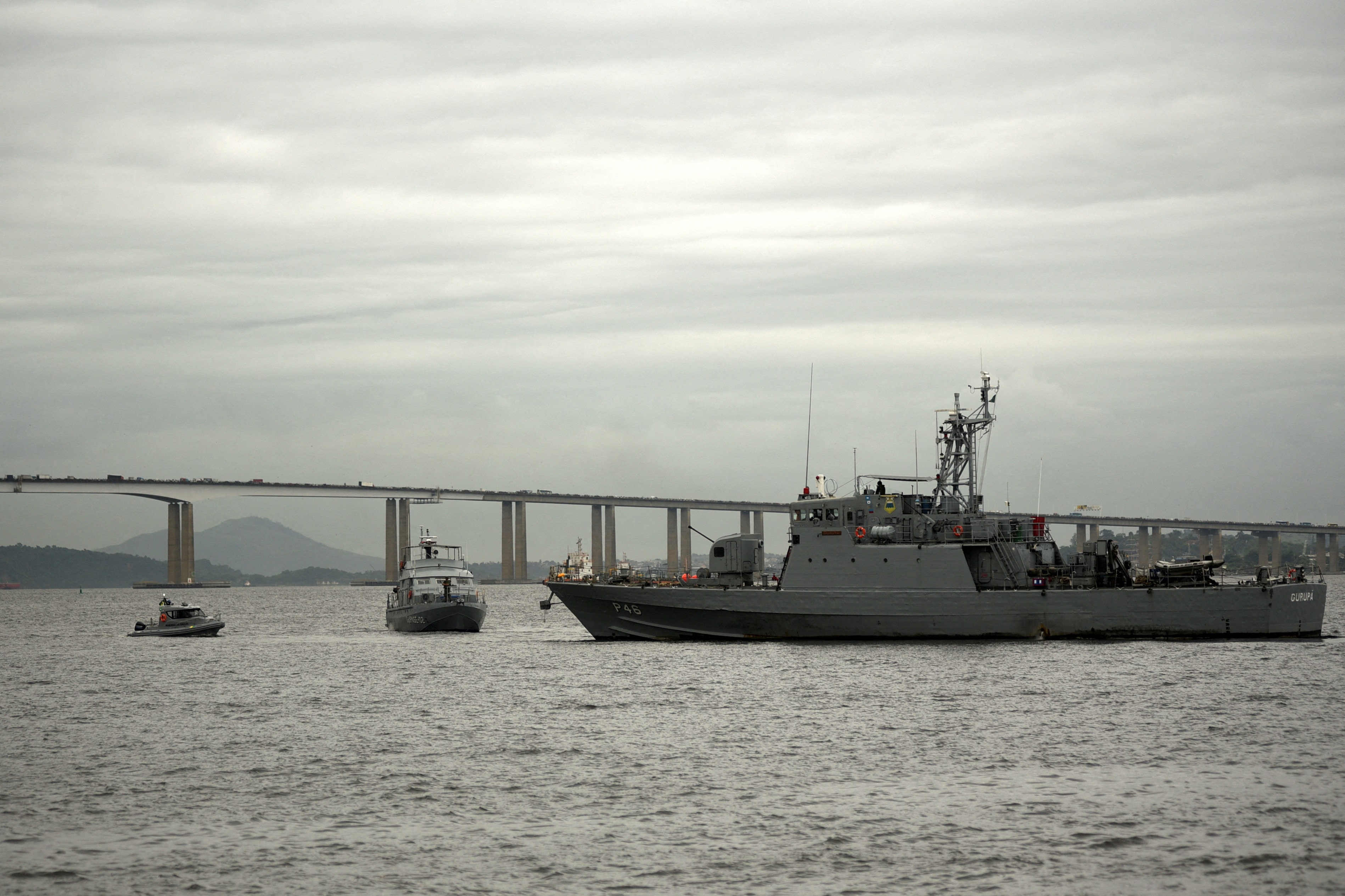 海军船只在博塔福戈湾的风景区巡逻,博物馆与里约标志性的糖面包山之间,海军陆战队员则从邻近海滩的登陆艇上登陆。