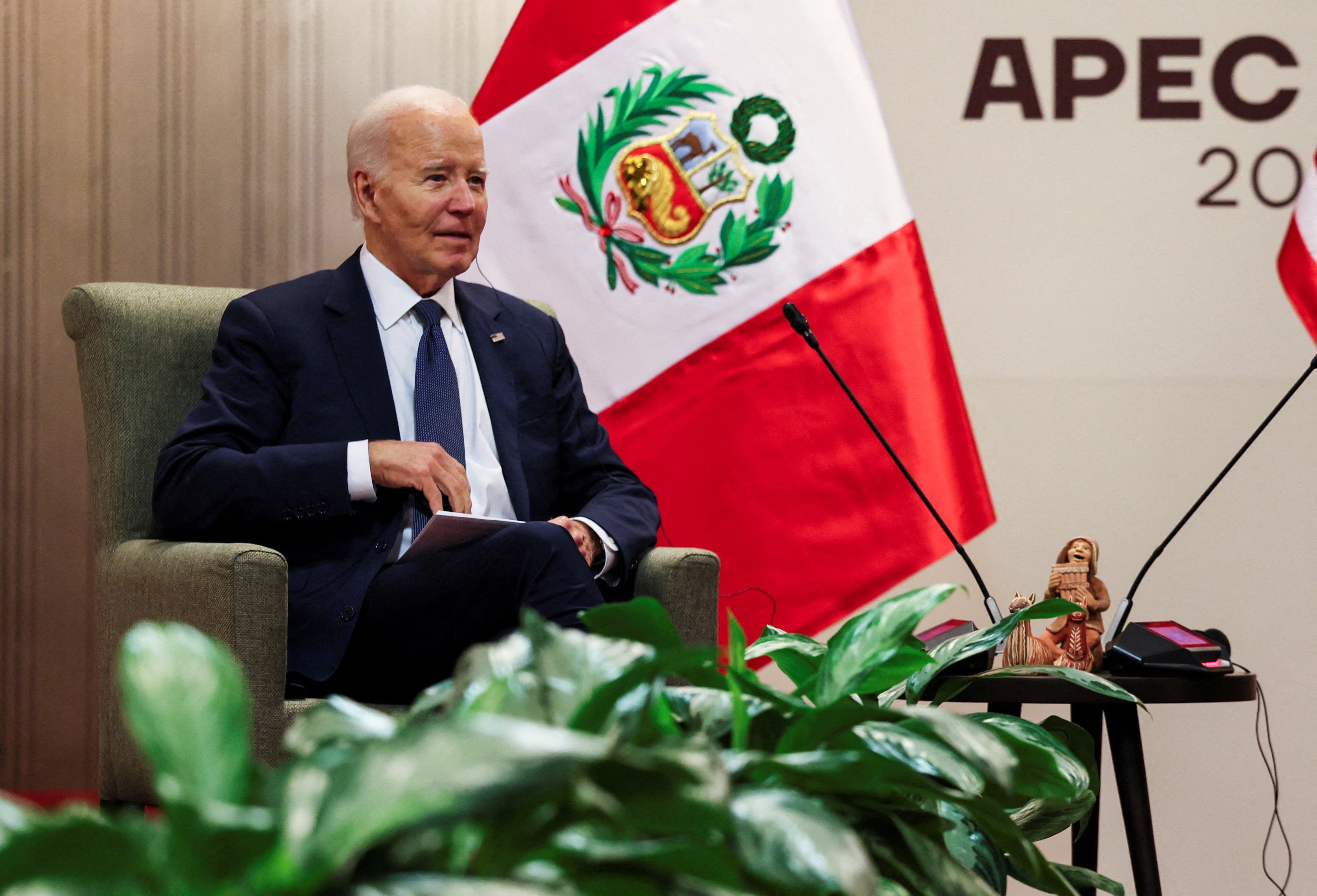 美国总统乔·拜登与秘鲁总统迪娜·博卢阿特在2024年11月15日于秘鲁利马举行的亚太经济合作组织(APEC)峰会上会晤。路透社/莉亚·米利斯/档案照片