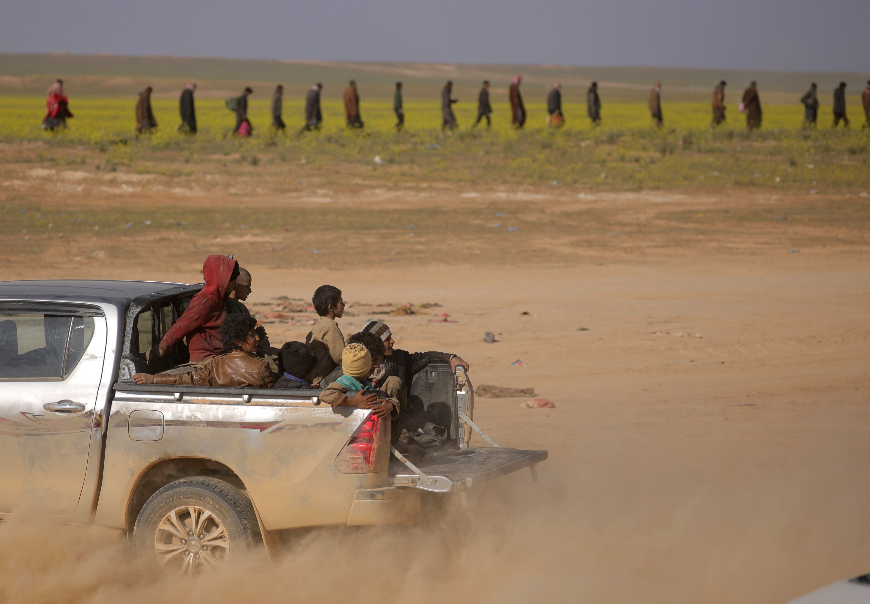 在2019年IS的“哈里发”崩溃时,至少204名雅兹迪被解救。这里可以看到一群被救的孩子在巴古兹附近的皮卡车后面骑行。路透社/罗迪·赛义德这名沙特战士后来逃跑,留下了罗金。孤独而害怕的罗金说,他说服一个IS家庭收留他,在他们向库尔德部队投降时假装是他们的儿子。