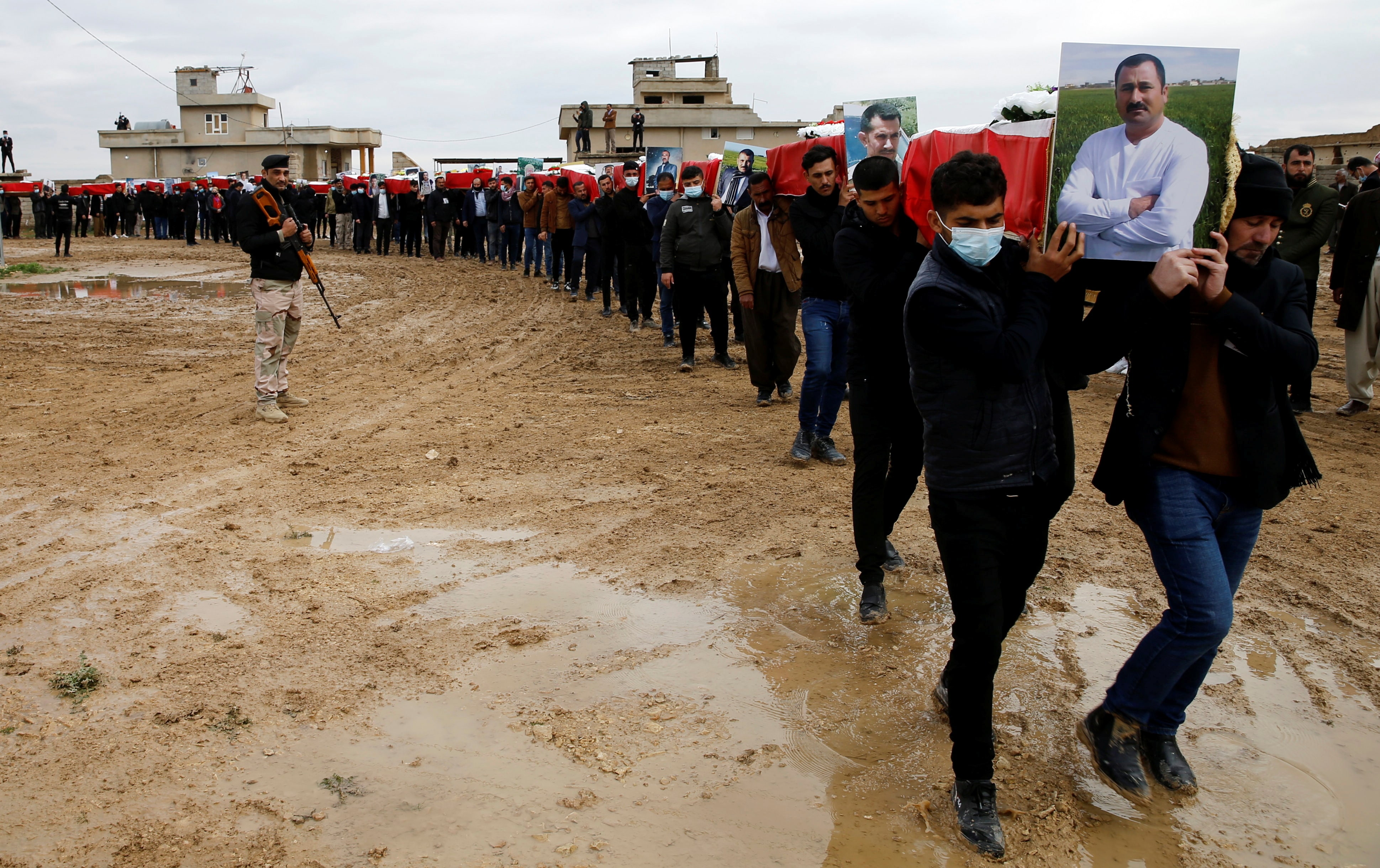 伊拉克官员表示,IS战士杀死了数千名雅兹迪人。哀悼者在这里抬着从集体墓中挖掘出来的100多名受害者的遗骸,并将其安葬在他们的故乡科乔村。路透社/泰尔·阿尔-苏达尼但每隔几个月,关于更多幸存者的消息在这个大约有一百万成员的社区中回响,其中近一半在伊拉克。