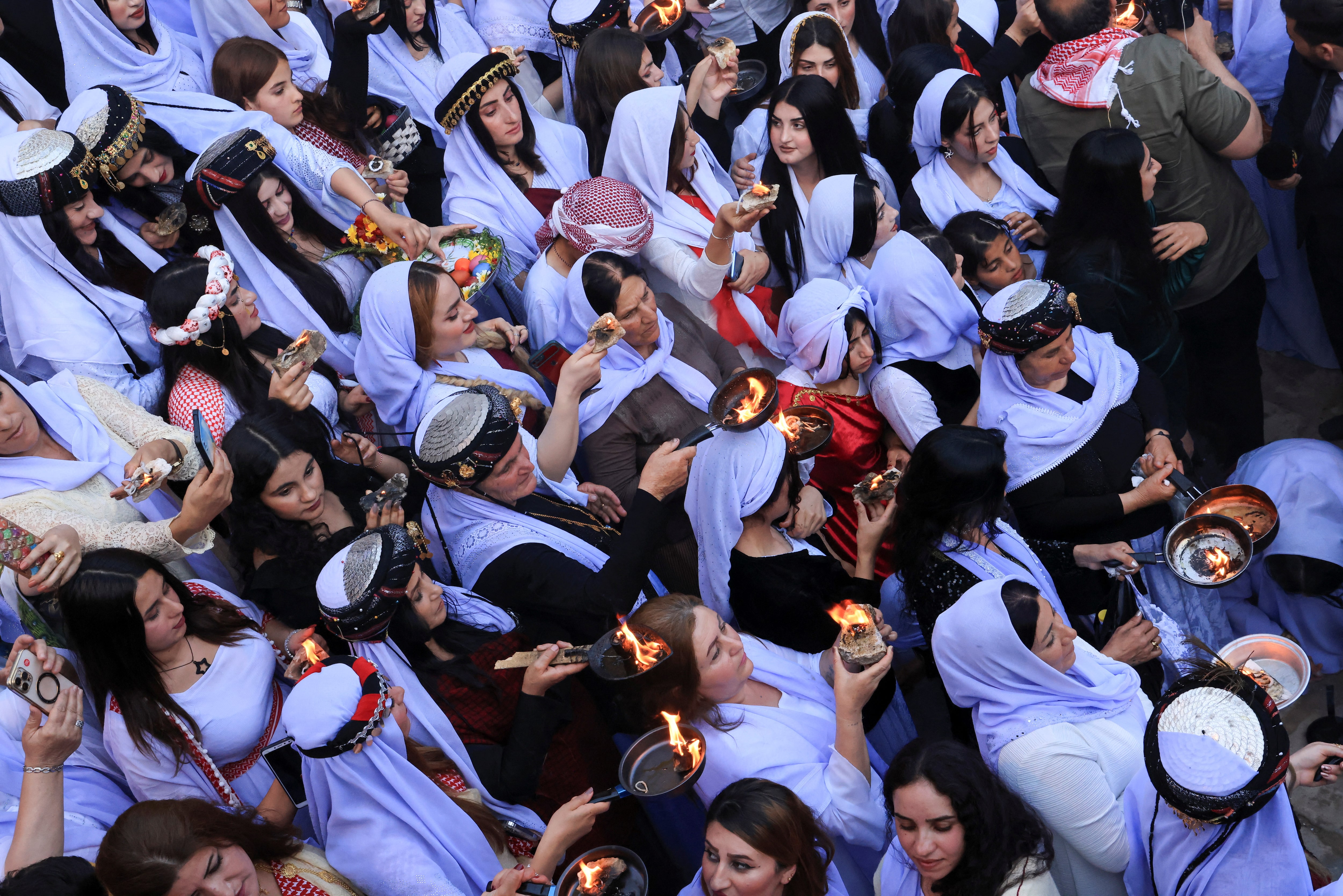 雅兹迪女性参加了四月标志红色星期三的仪式,庆祝雅兹迪新年。伊斯兰国认为雅兹迪人的古老信仰是异端。路透社/阿里·贾拉尔伊斯梅尔表示,包括伊拉克联邦政府、北伊拉克的库尔德地区当局及其在叙利亚的库尔德同胞之间的竞争关系,意味着他们之间几乎没有合作。