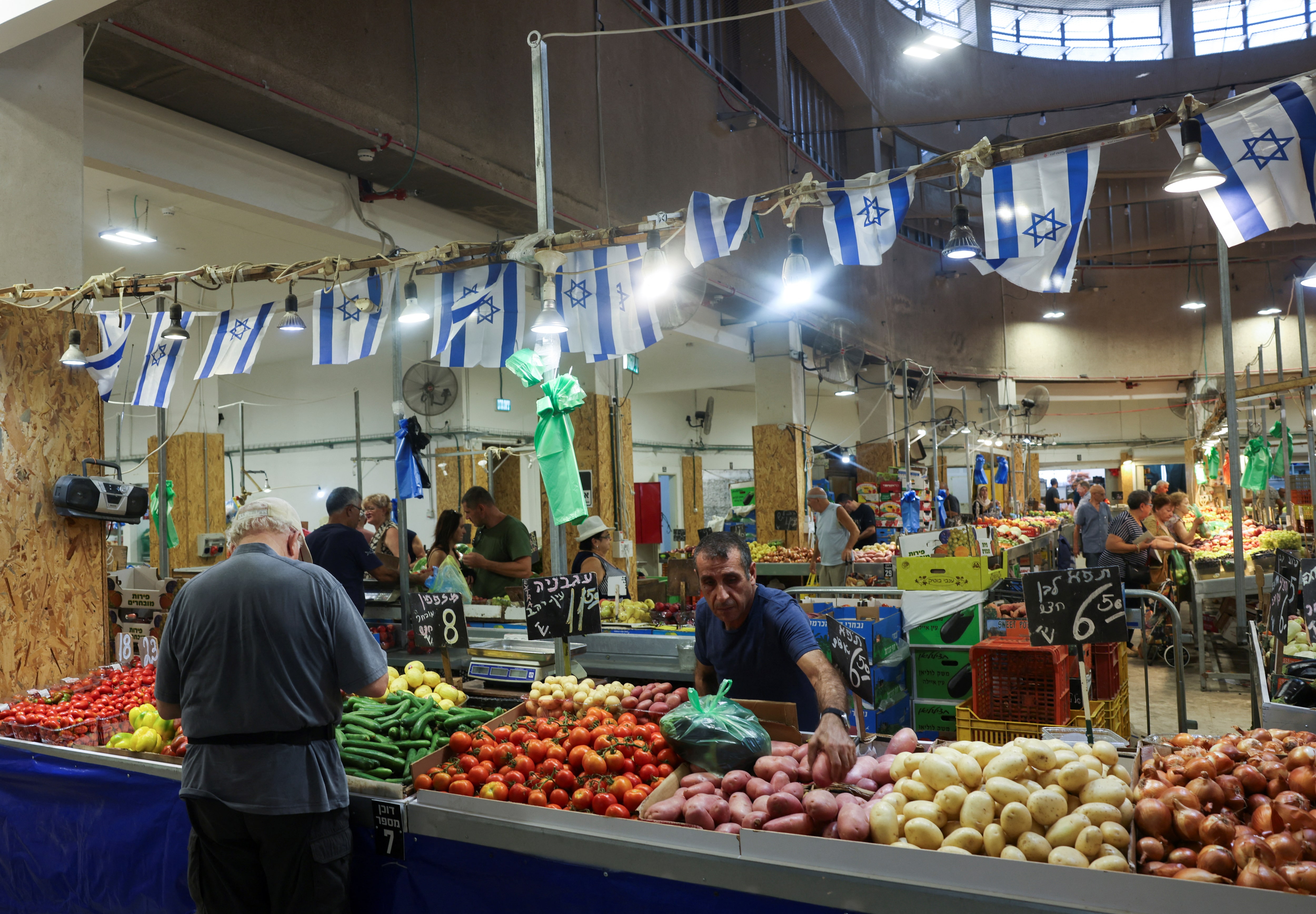 人们在以色列海法的一个市场购物,时间是2024年8月5日。摄影:罗宁·兹弗隆 - 路透社耶路撒冷2024年11月17日(路透社) - 以色列经济在2024年第三季度的增长超出预期,因在2023年10月与哈马斯的冲突开始后,经济在经历一段疲软期后有所恢复。中央统计局今天星期日发布的初步估计显示,国内生产总值在7月至9月期间同比增长3.8%,超过路透社调查预期的2.9%。按人均计算,第三季度国内生产总值增长2.6%。