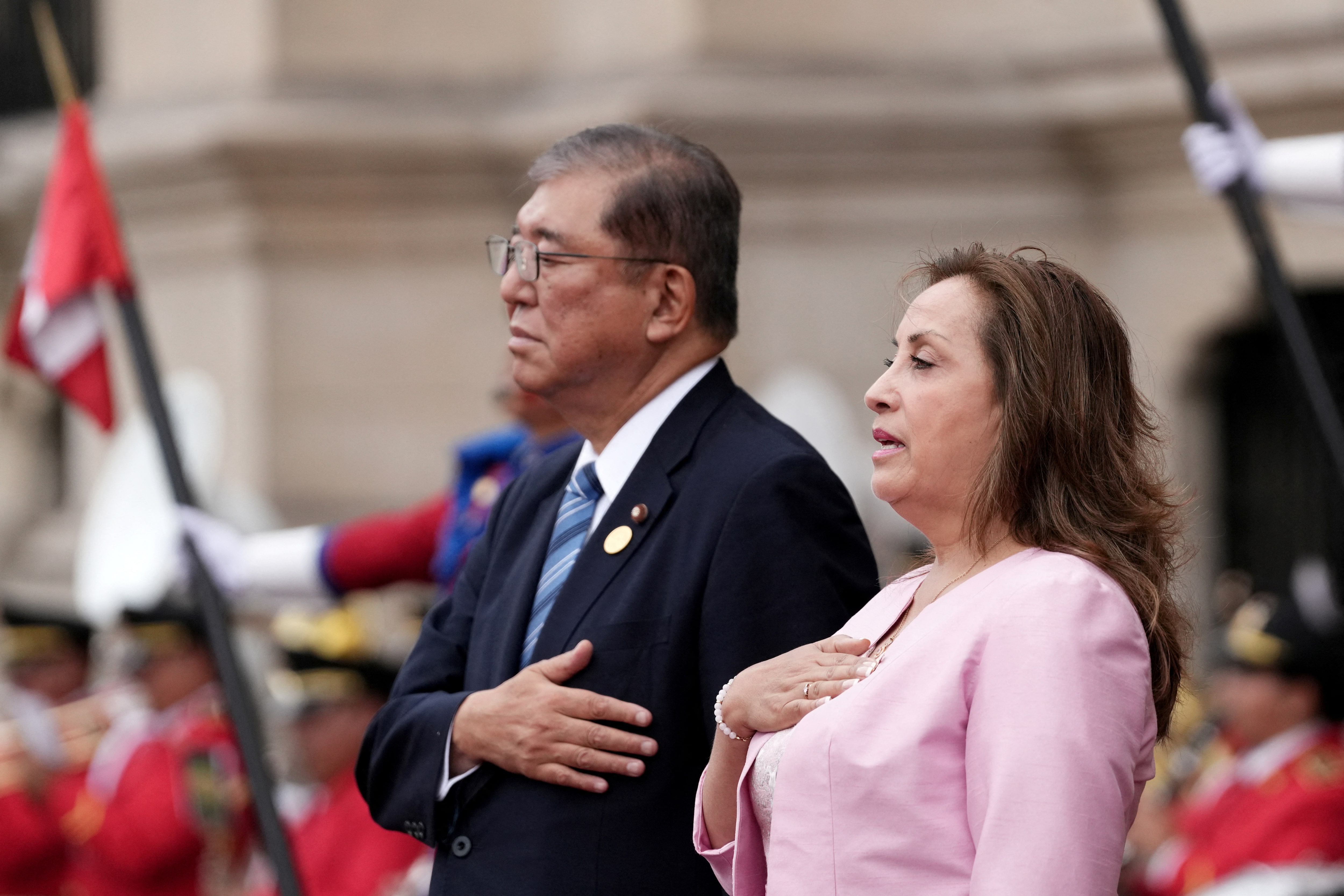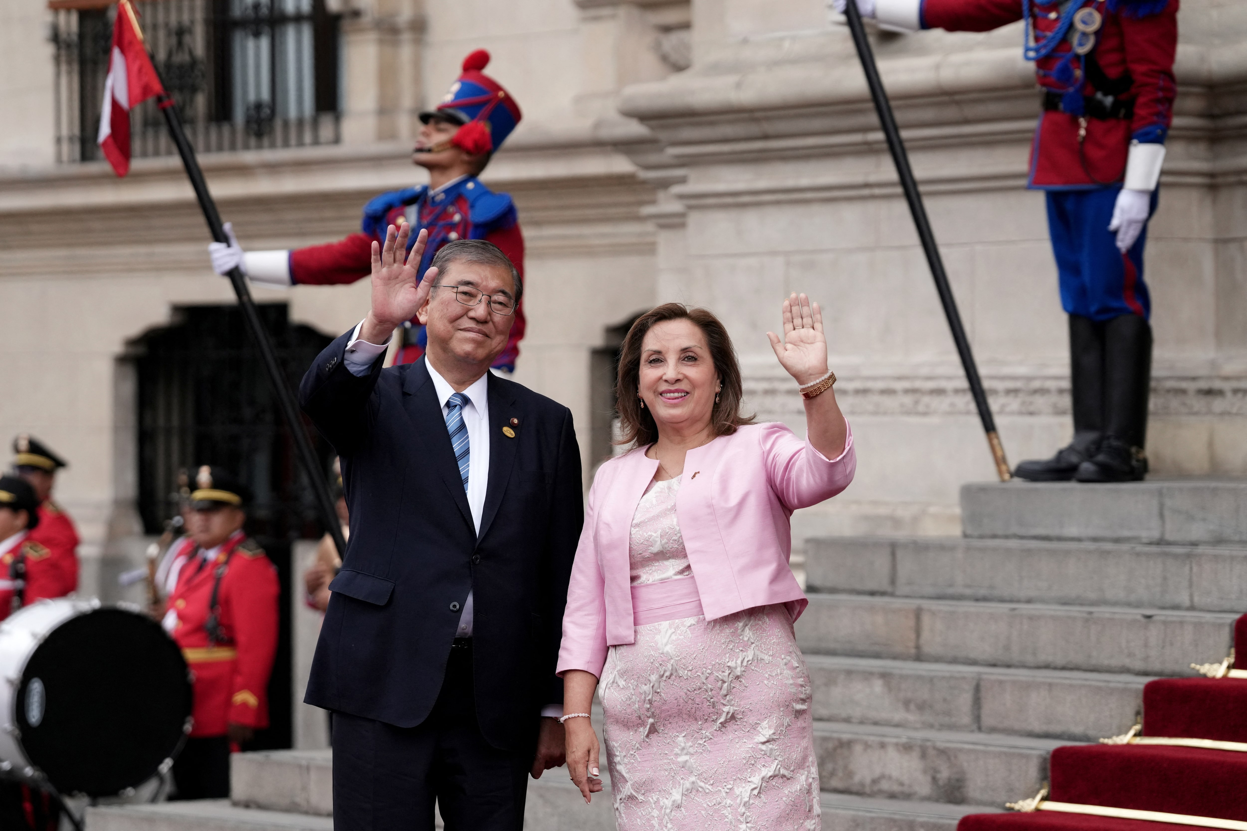 秘鲁总统迪娜·博卢阿尔特在2024年11月17日于秘鲁利马欢迎日本首相石破茂。路透社/安吉拉·庞塞