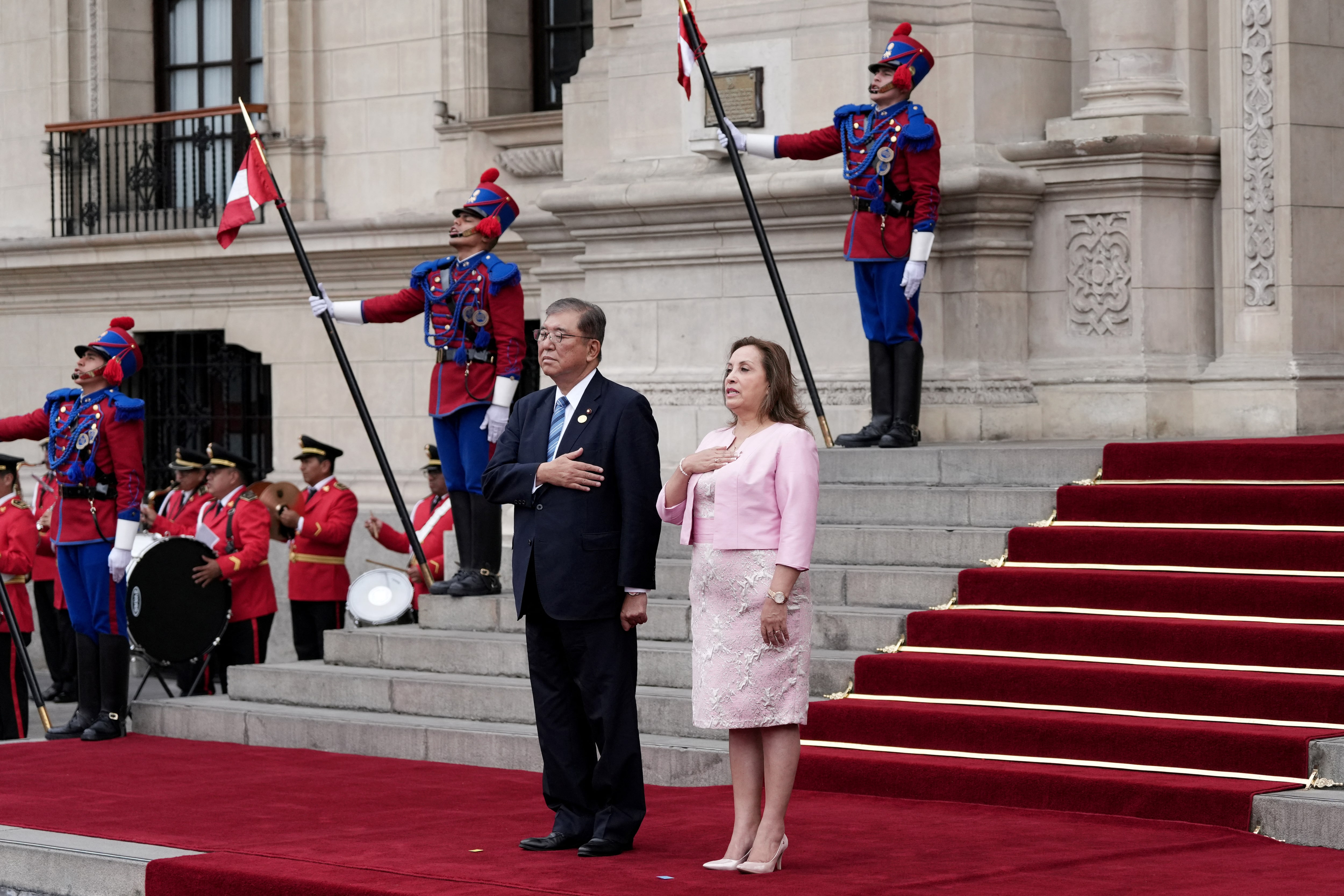 秘鲁总统迪娜·博卢阿尔特在2024年11月17日于秘鲁利马欢迎日本首相石破茂。路透社/安吉拉·庞塞