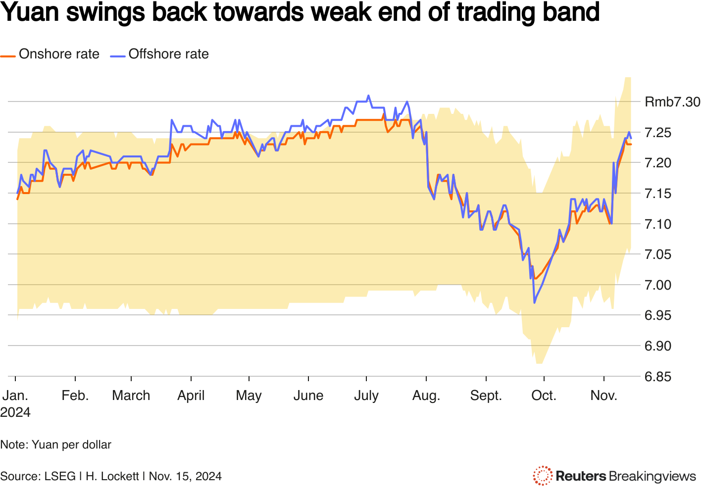自11月6日唐纳德·特朗普当选美国总统以来,人民币已下跌约2%。他承诺对所有来自中国的进口商品征收60%的关税。