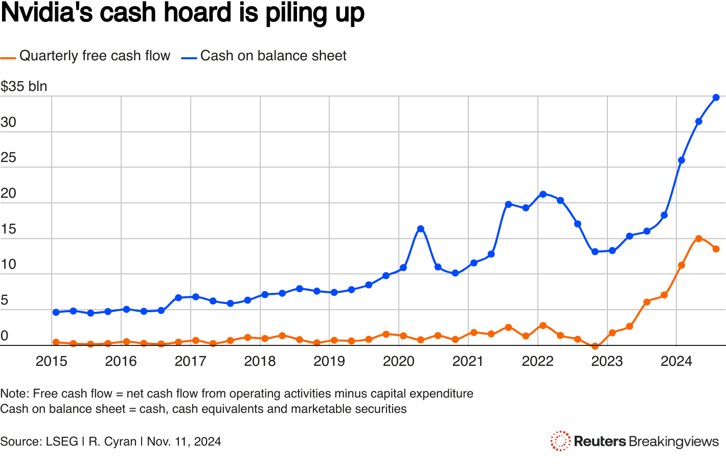 Nvidia的现金储备已达到350亿美元,季度自由现金流已触及150亿美元。两者都