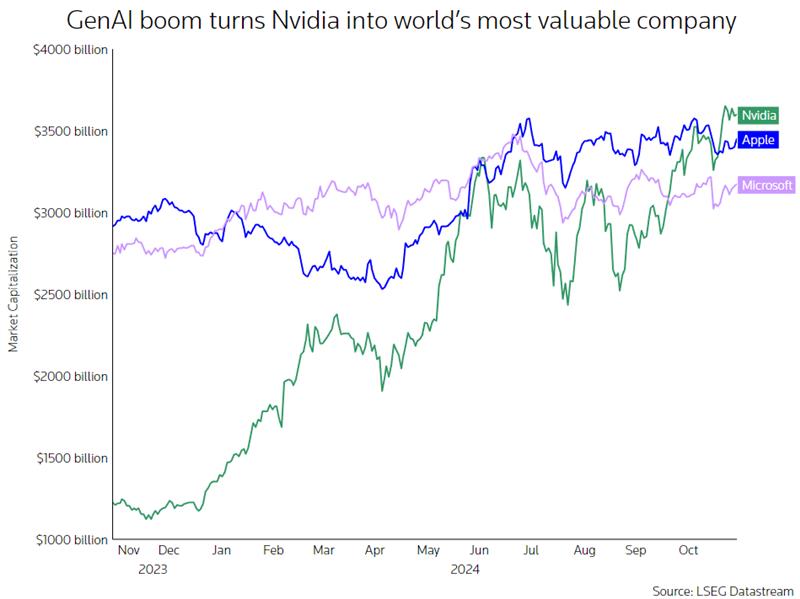 在Nvidia的业绩中,该公司已超越苹果(AAPL.O)成为全球最有价值的公司,这将对推动或削弱与AI相关股票的长期反弹起到重要作用。Nvidia自己的股票今年几乎翻了三倍。Nvidia的调整后毛利率预计将在第四季度下降超过三个百分点,降至73.6%,这主要是由于开发和扩大新AI芯片生产的高成本所致。