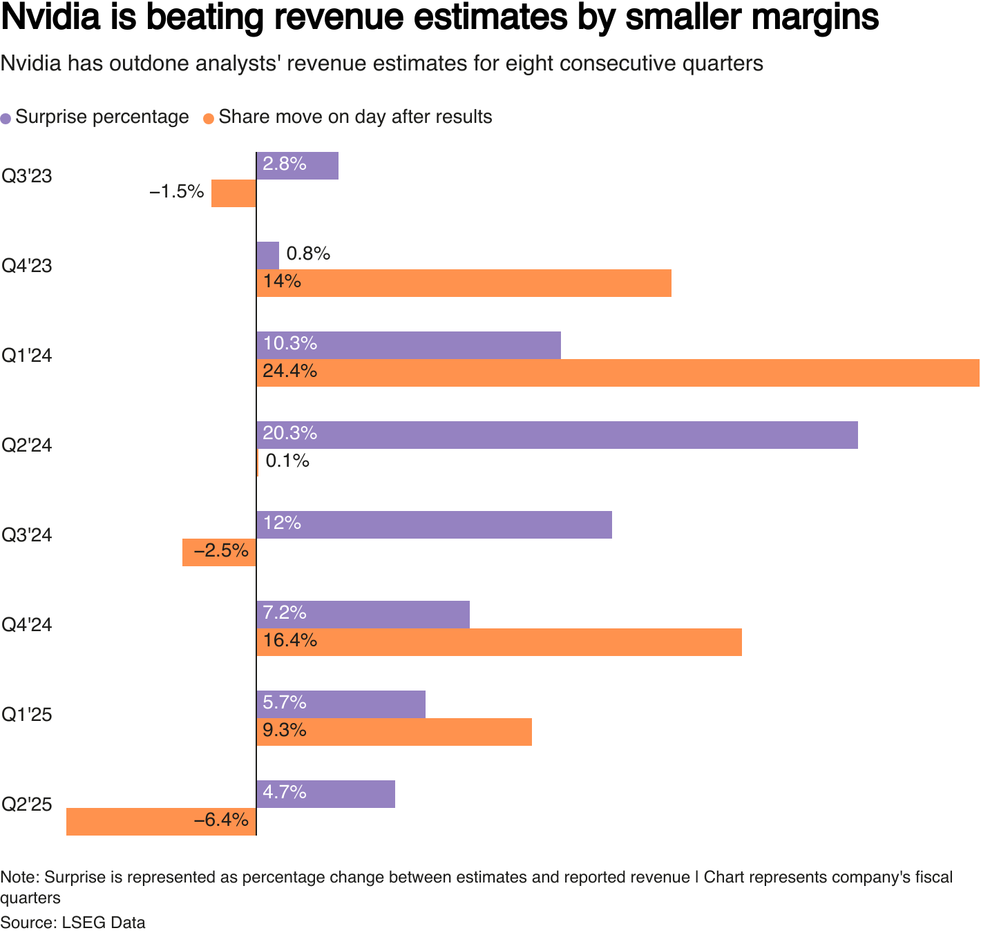 图表表示Nvidia超出或未达到分析师对季度收入预期的百分比。Nvidia已经连续八个季度超出预期。