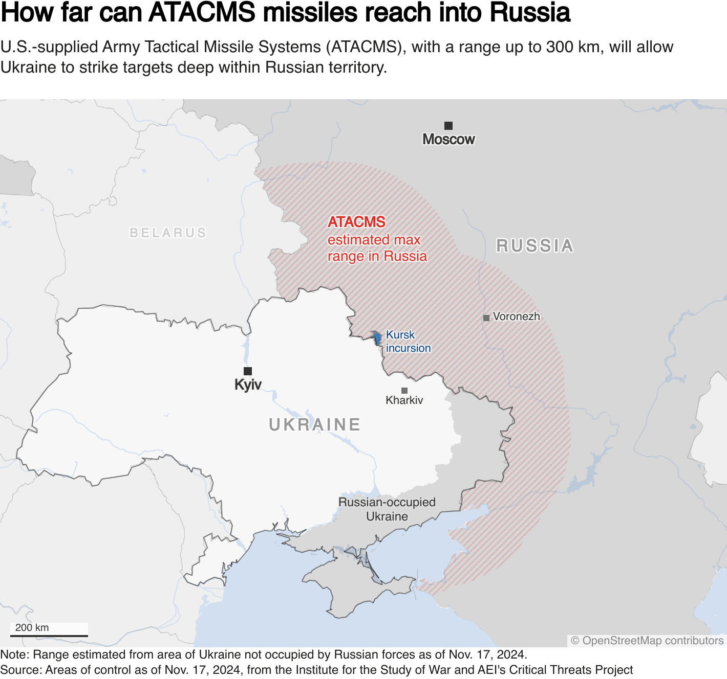 一张显示ATACAMS导弹打击俄罗斯境内区域的地图。