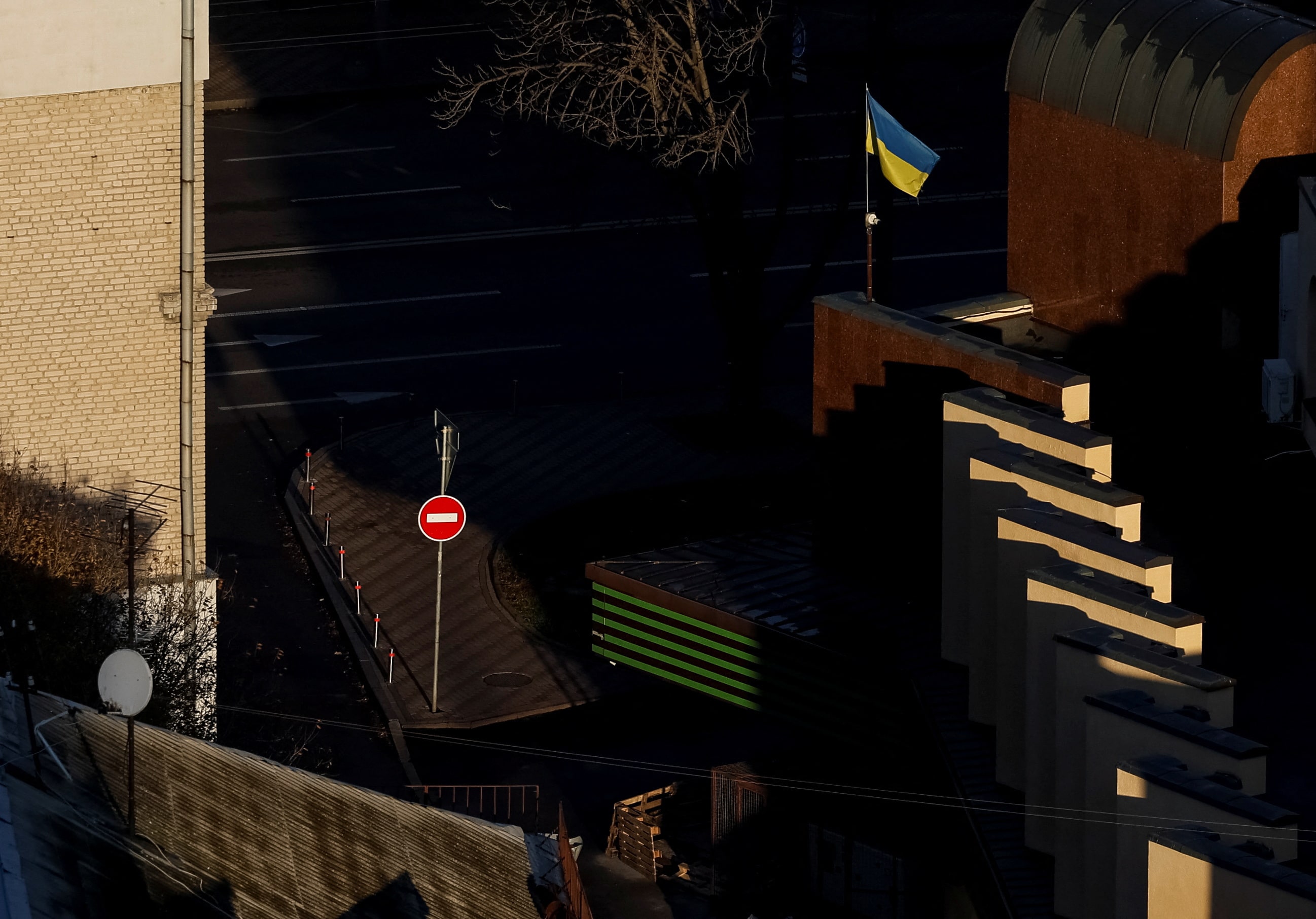 第1项,共2项 一面乌克兰国旗和一个路标在俄罗斯导弹袭击期间的清晨被看到,背景是俄罗斯对乌克兰的攻击,地点在乌克兰基辅,时间是2024年11月17日。路透社/格列布·加拉尼奇