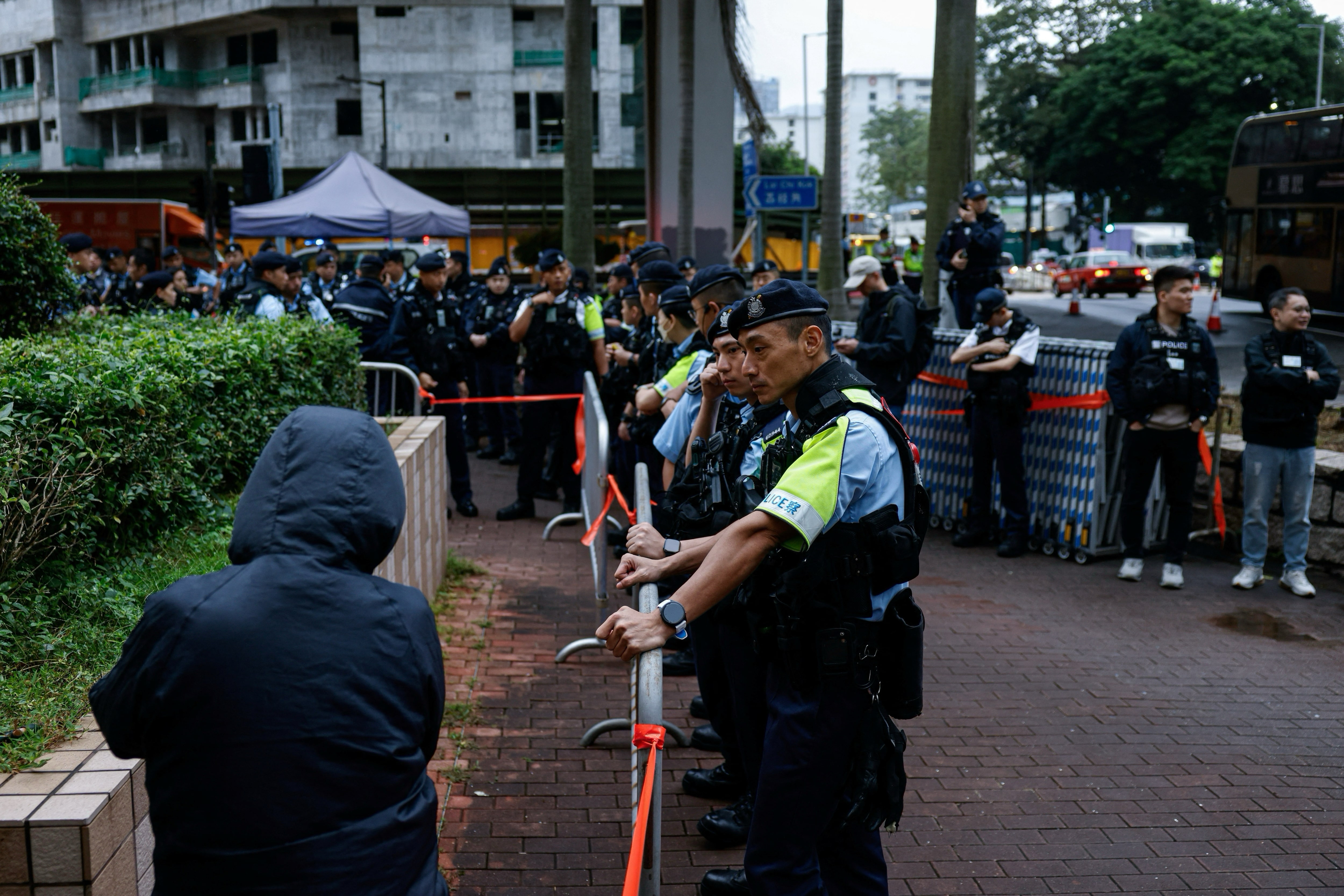 警方在西九龙裁判法院周围的几个街区形成了紧密的安全警戒,数百名支持者在细雨中排队,举着雨伞试图在主法庭和几个溢出法庭内争取一个座位。
