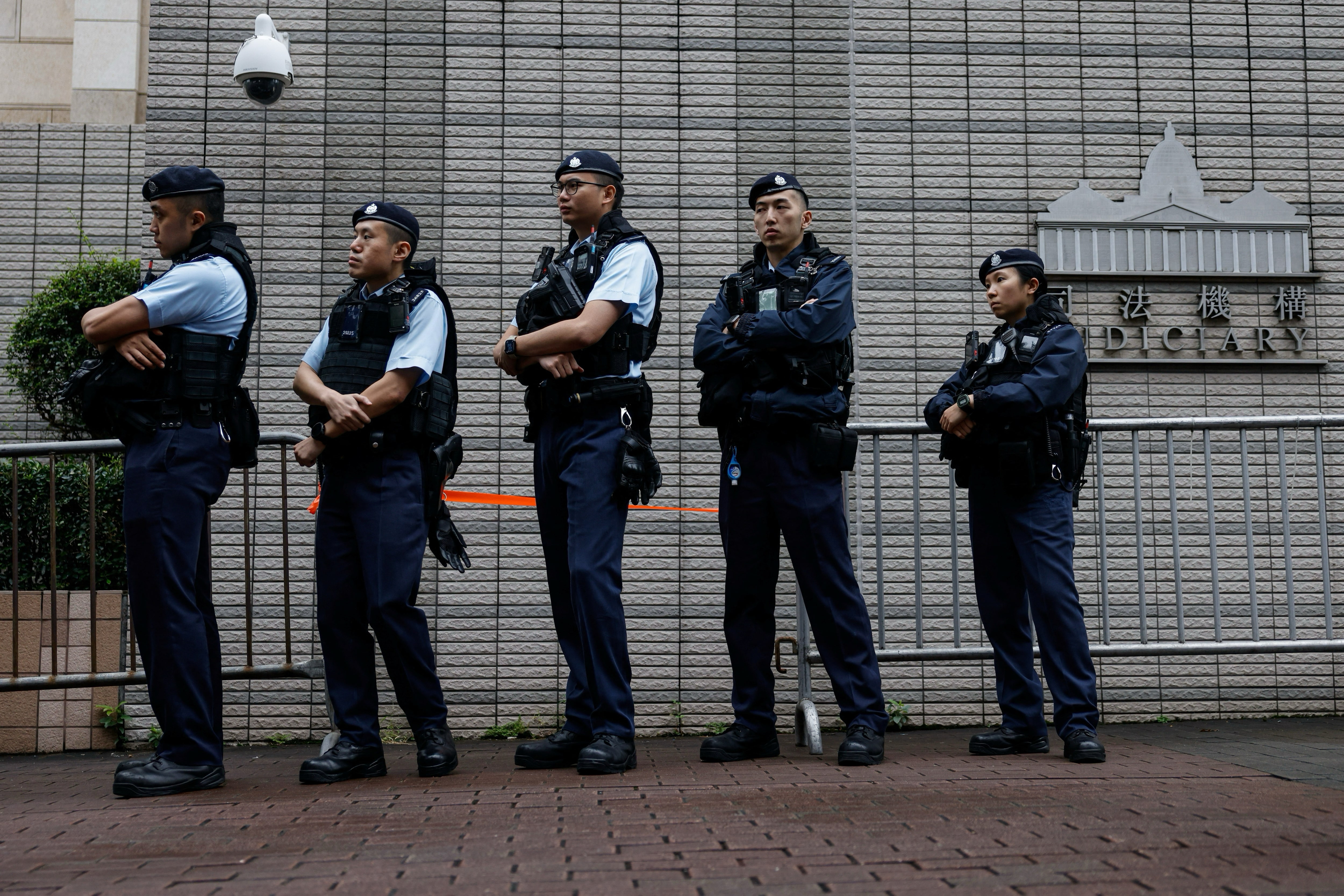 第1项,共4项 法院工作人员在等待进入西九龙裁判法院大楼的人群旁升起国旗,在对45名被定罪的支持民主活动人士进行判刑之前,他们因违反国家安全法而被控罪,地点在中国香港,2024年11月19日。路透社/泰隆·萧