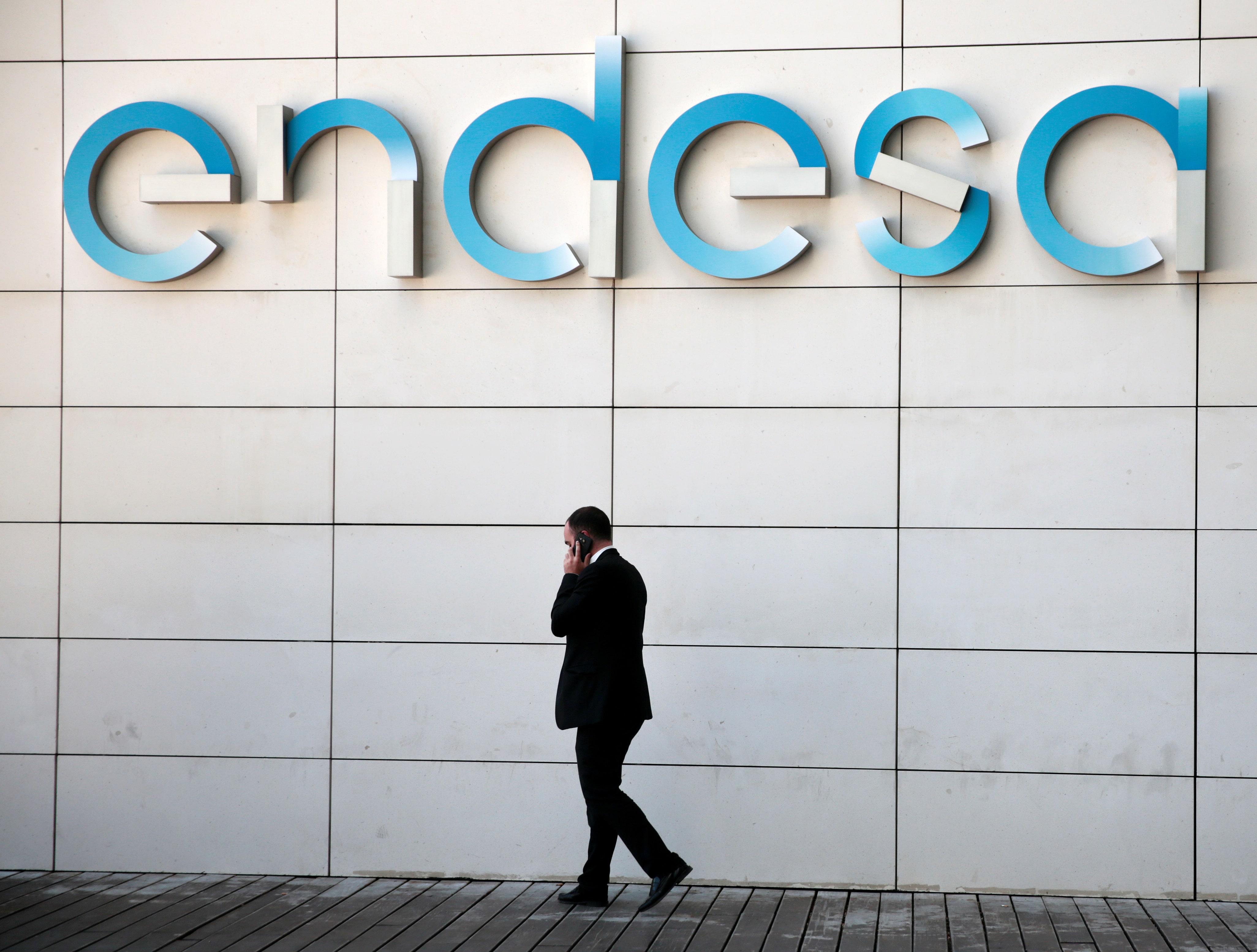 项目1共2个档案照片。一名男子在西班牙电力公司Endesa的标志下走过,地点在西班牙马德里。2016年4月26日。路透社/安德烈亚·科马斯