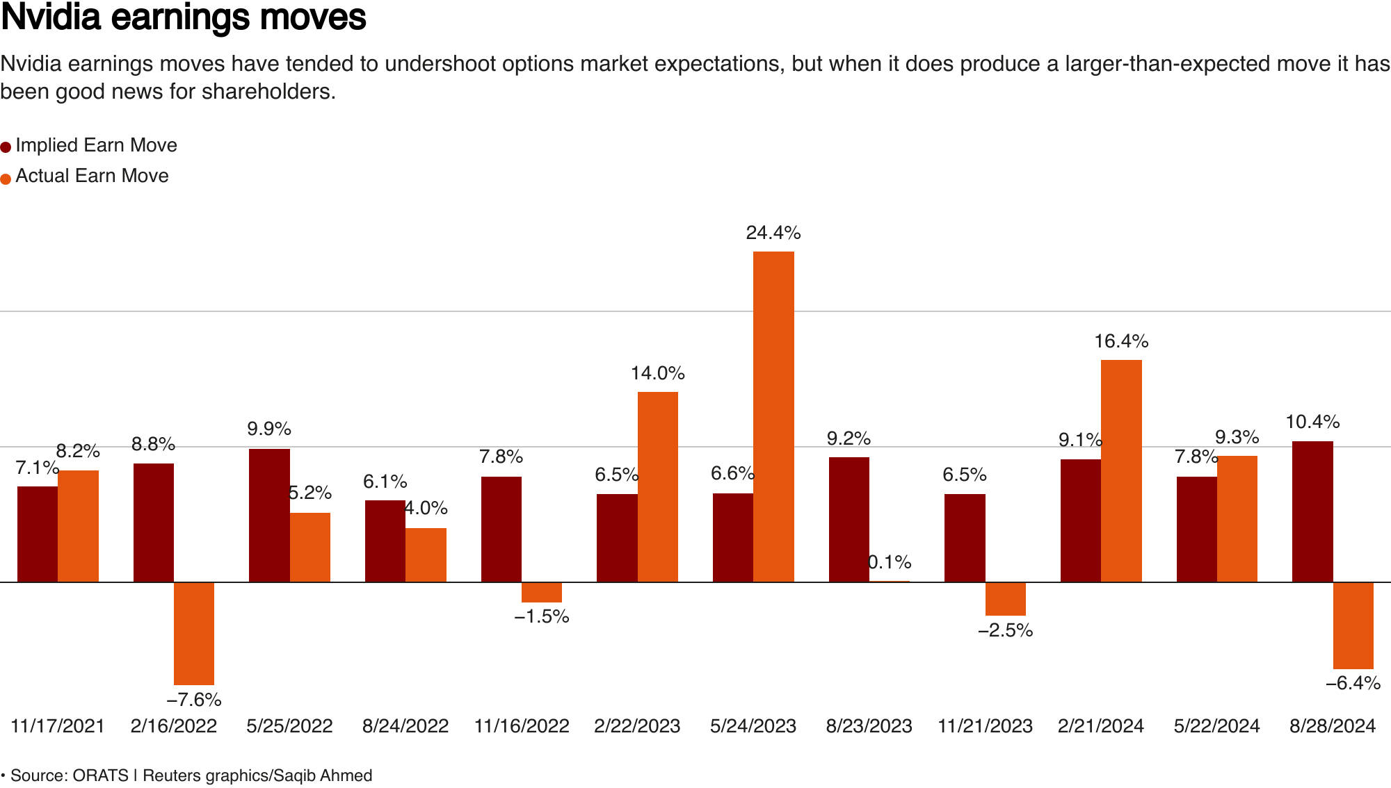 分组条形图显示 Nvidia 股价收益的隐含与实际收益变动。