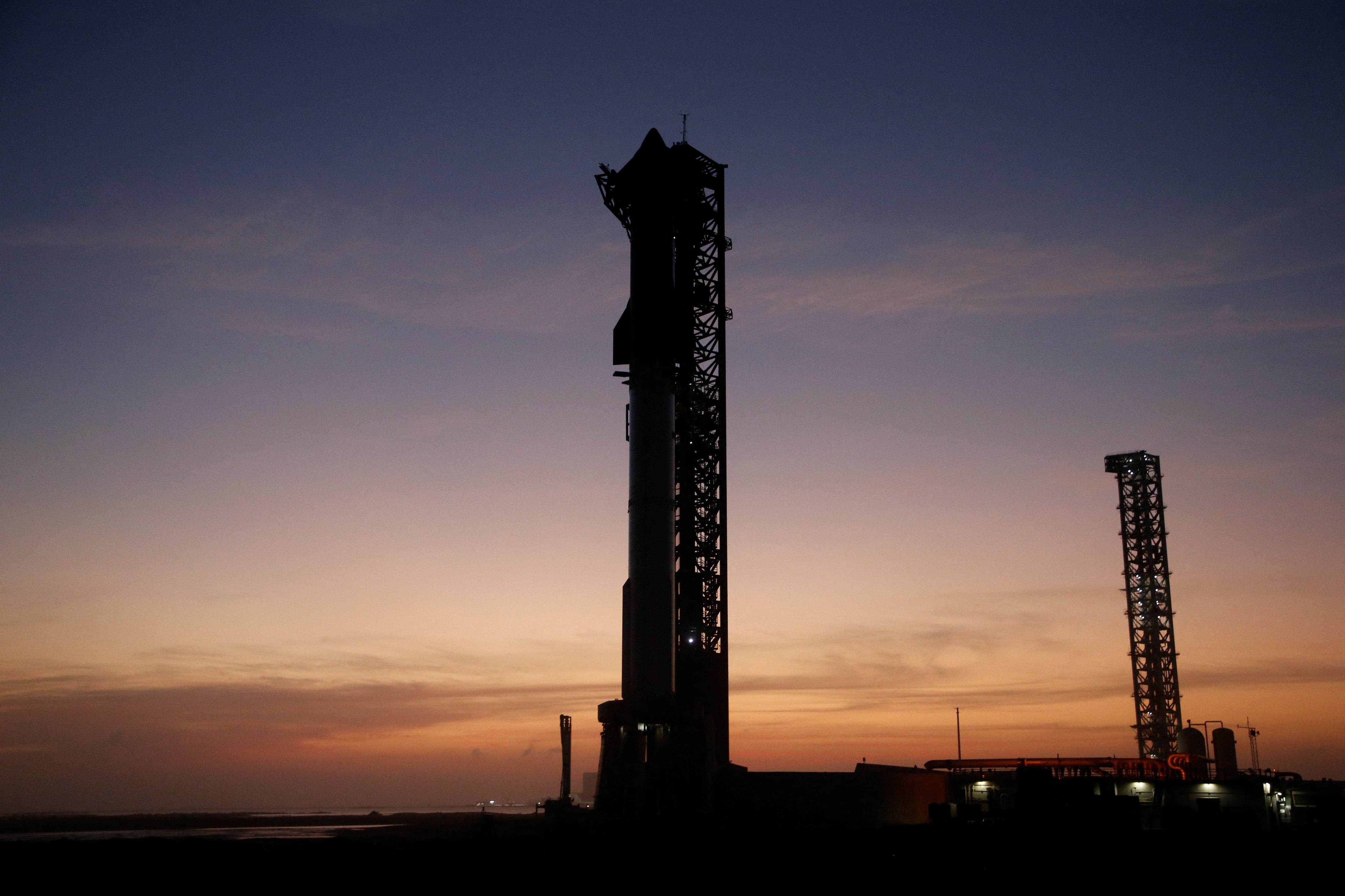 SpaceX的下一代星际飞船在其强大的超级重型火箭顶部准备发射,地点位于美国德克萨斯州布朗斯维尔的公司博卡奇卡发射场,2024年11月18日。路透社/乔·斯基珀佛罗里达州西棕榈滩,11月19日(路透社)- 美国当选总统唐纳德·特朗普将于周二前往德克萨斯州,亲自参加SpaceX的火箭发射,这显示了他与公司亿万富翁创始人兼首席执行官埃隆·马斯克的密切关系。一位熟悉此次行程的消息人士在周一确认了特朗普的计划,此前联邦航空管理局对德克萨斯州布朗斯维尔地区发布了“VIP活动”的临时飞行限制,这通常是在高调访问之前的做法。