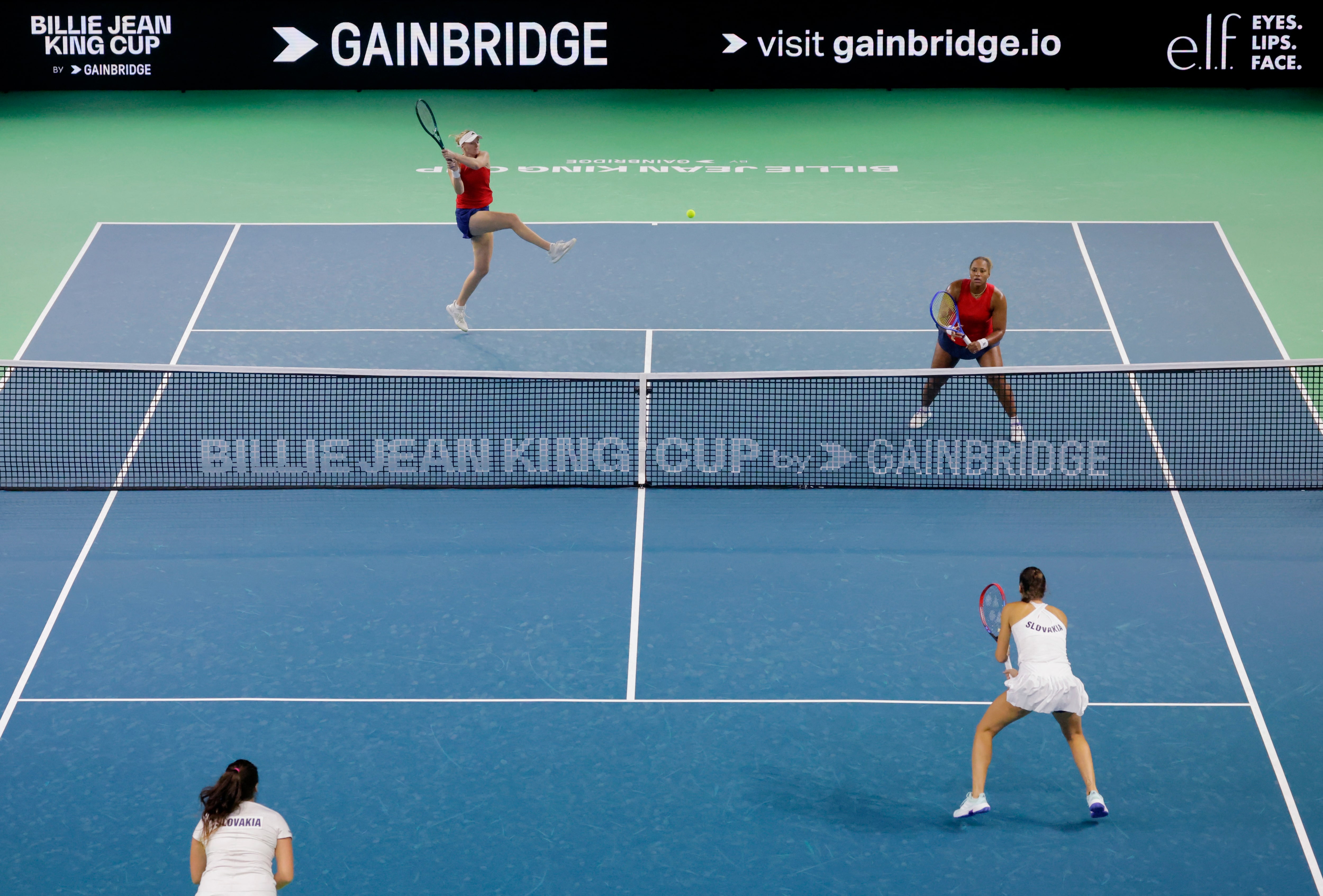 斯洛伐克的网球选手维多利亚·赫龙查科娃和特雷莎·米哈利科娃在2024年11月14日西班牙马拉加的双打比赛中对阵来自美国的两位选手。摄影:约翰·纳兹卡 - 路透社马拉加(西班牙)11月19日(阿拉伯路透社体育服务) - 斯洛伐克在网球比利·简·金杯决赛中晋级,维多利亚·赫龙查科娃和特雷莎·米哈利科娃在周二的比赛中强势反弹,战胜了英国队。