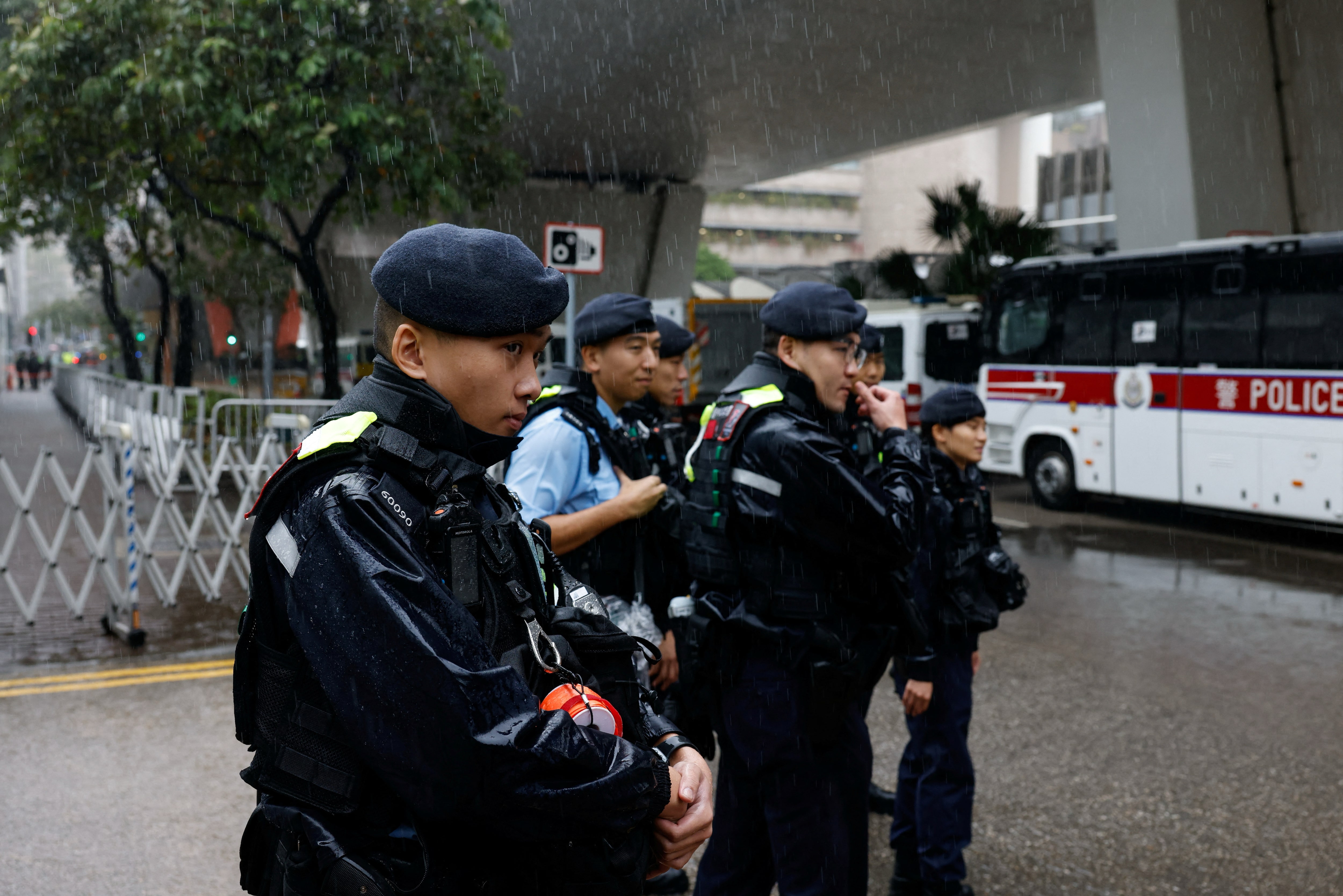 大约100人在倾盆大雨中排队,躲在伞下以确保在法庭上占有一席之地,周围部署了数百名警察。