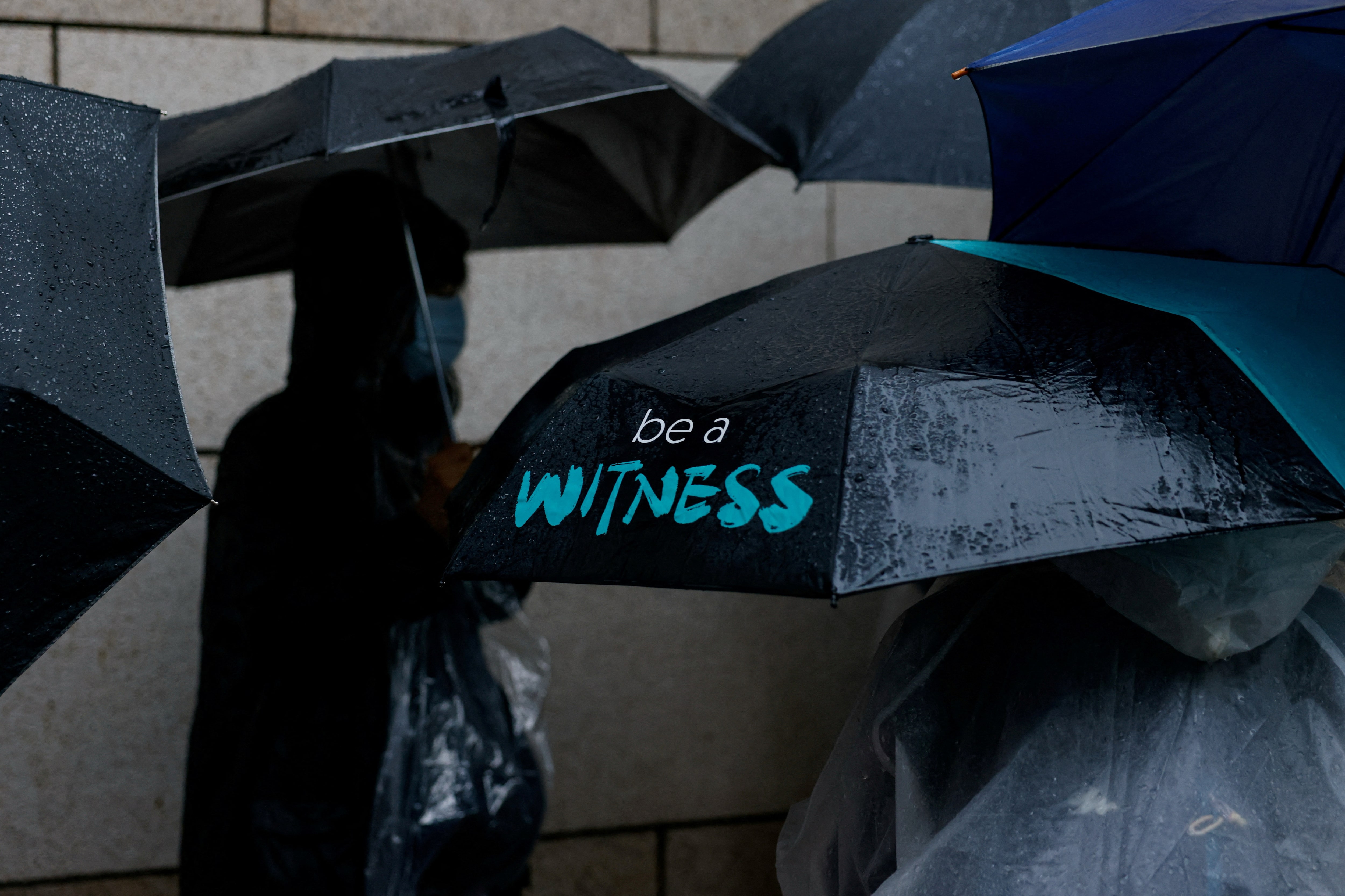 大约100人在倾盆大雨中排队,躲在伞下以确保在法庭上占有一席之地,周围部署了数百名警察。
