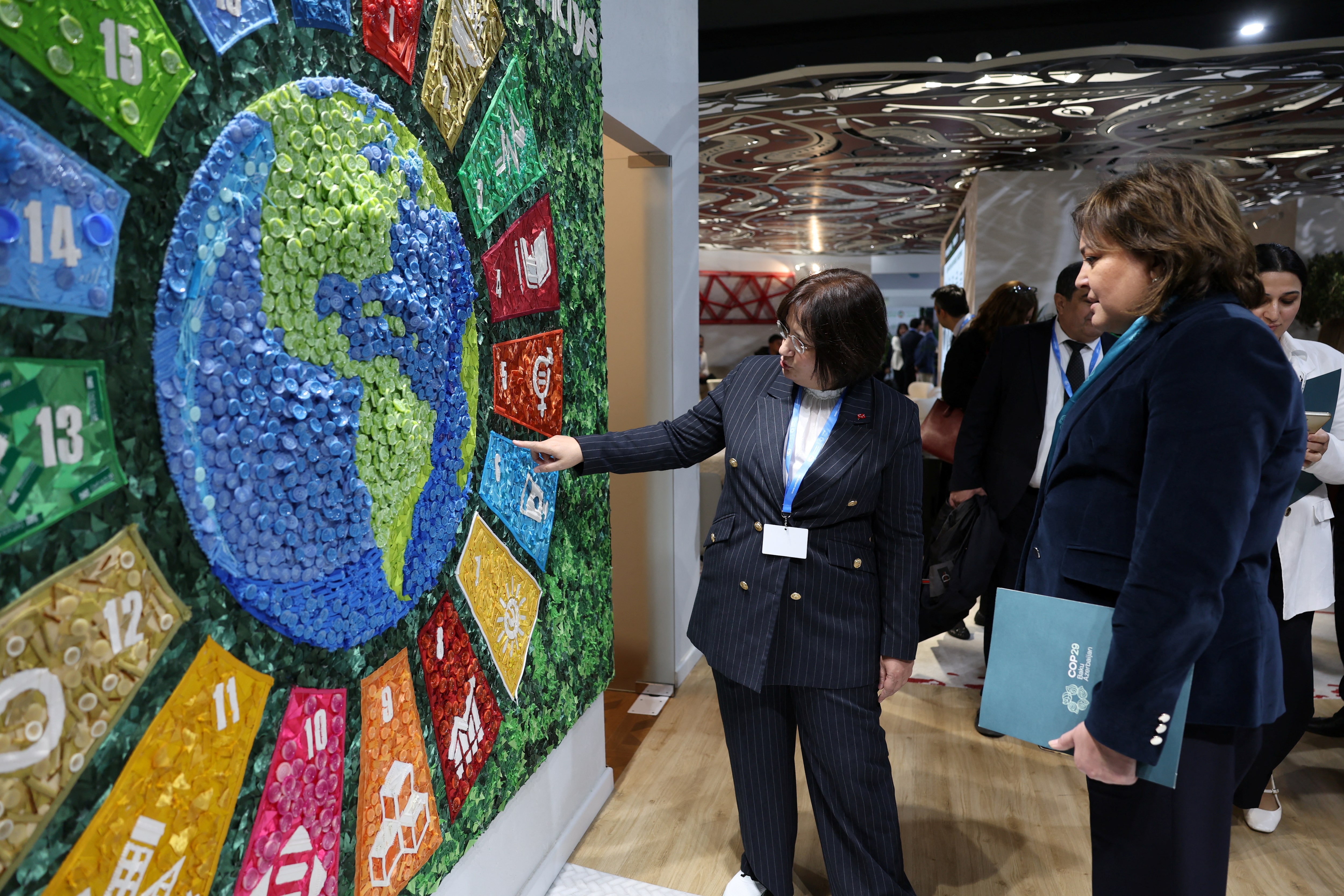 第1项,共4项 法特玛·瓦兰克,土耳其环境、城市化和气候变化副部长,以及阿塞拜疆生态和自然资源副部长乌马伊拉·塔吉耶娃于2024年11月19日在阿塞拜疆巴库的联合国气候变化大会COP29期间参观土耳其展馆。路透社/穆拉德·塞泽尔