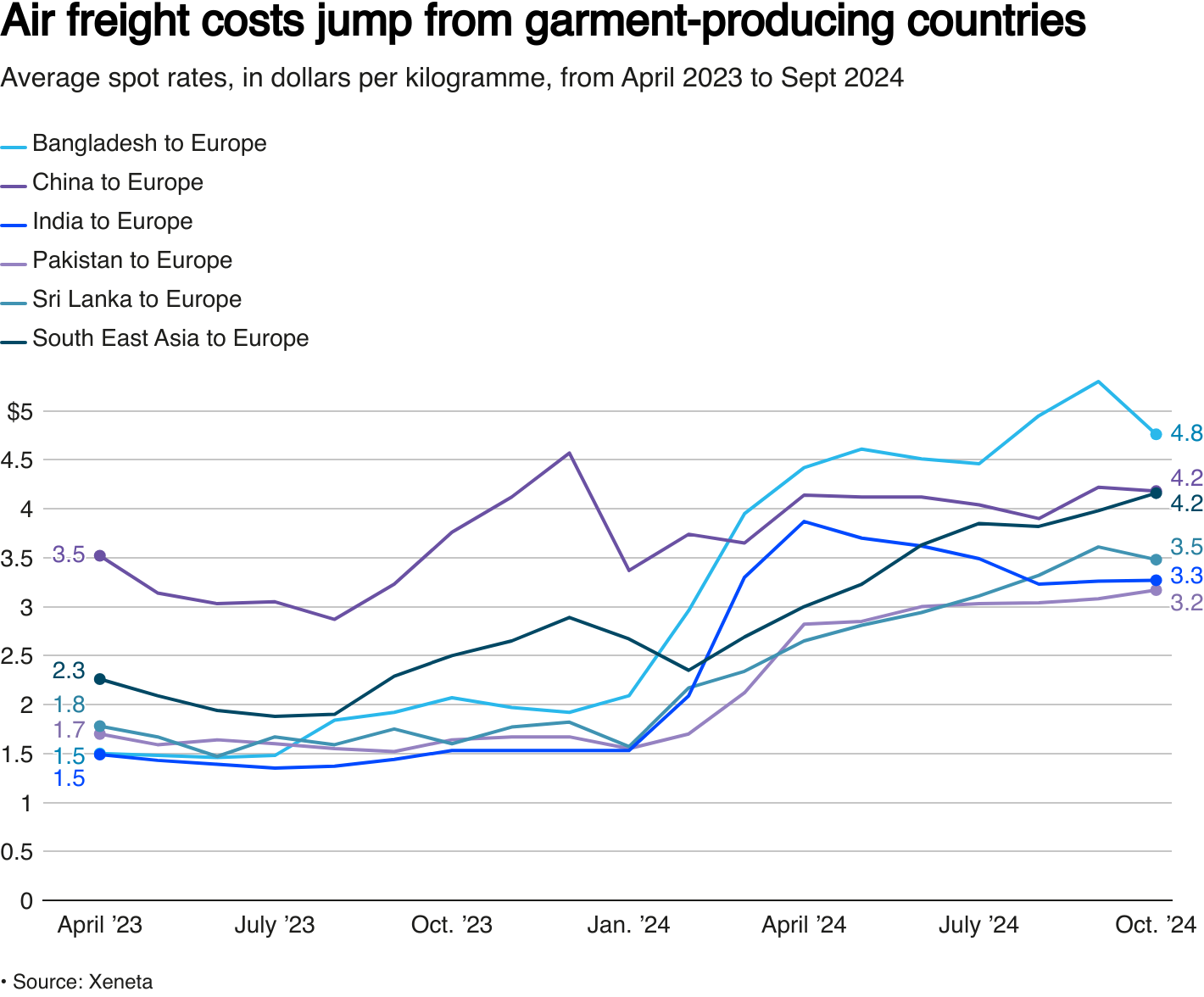 自从红海的不安全局势中断了全球海运路线以来,服装零售商——以及出口商总体上——增加了航空运输的使用。