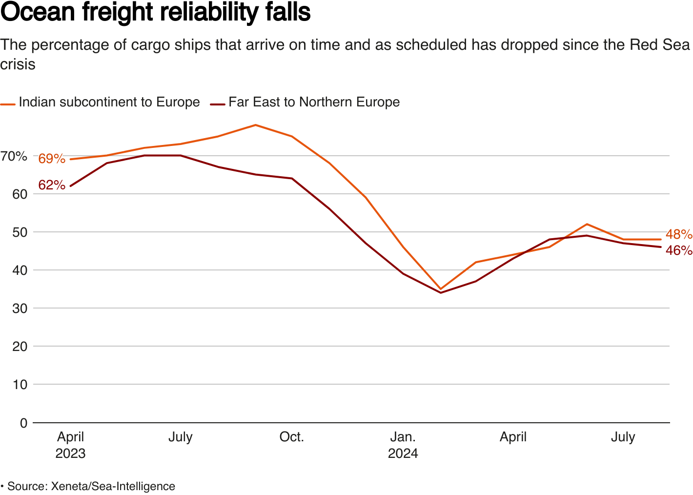 海运可靠性的一项指标——按时到达和按计划到达的船只百分比——显示出过去18个月可靠性的下降