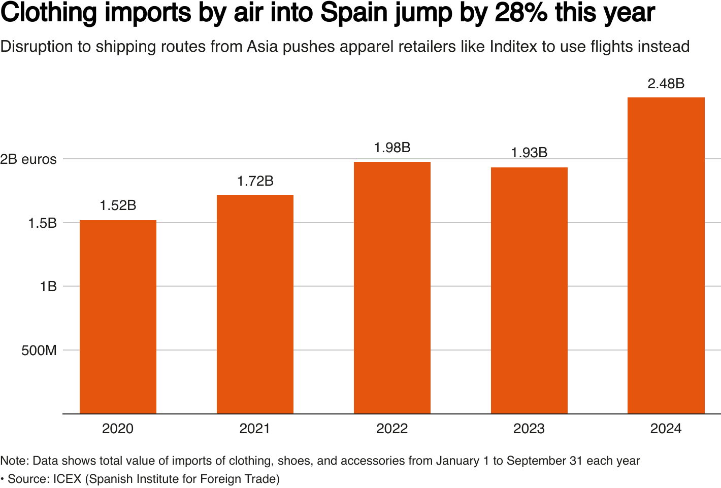 在回应路透社关于航空运输数据的问题时,Inditex表示,他们对来自亚洲的“大多数”产品使用海运,但在特殊情况下,如红海危机,可能会使用其他运输方式。