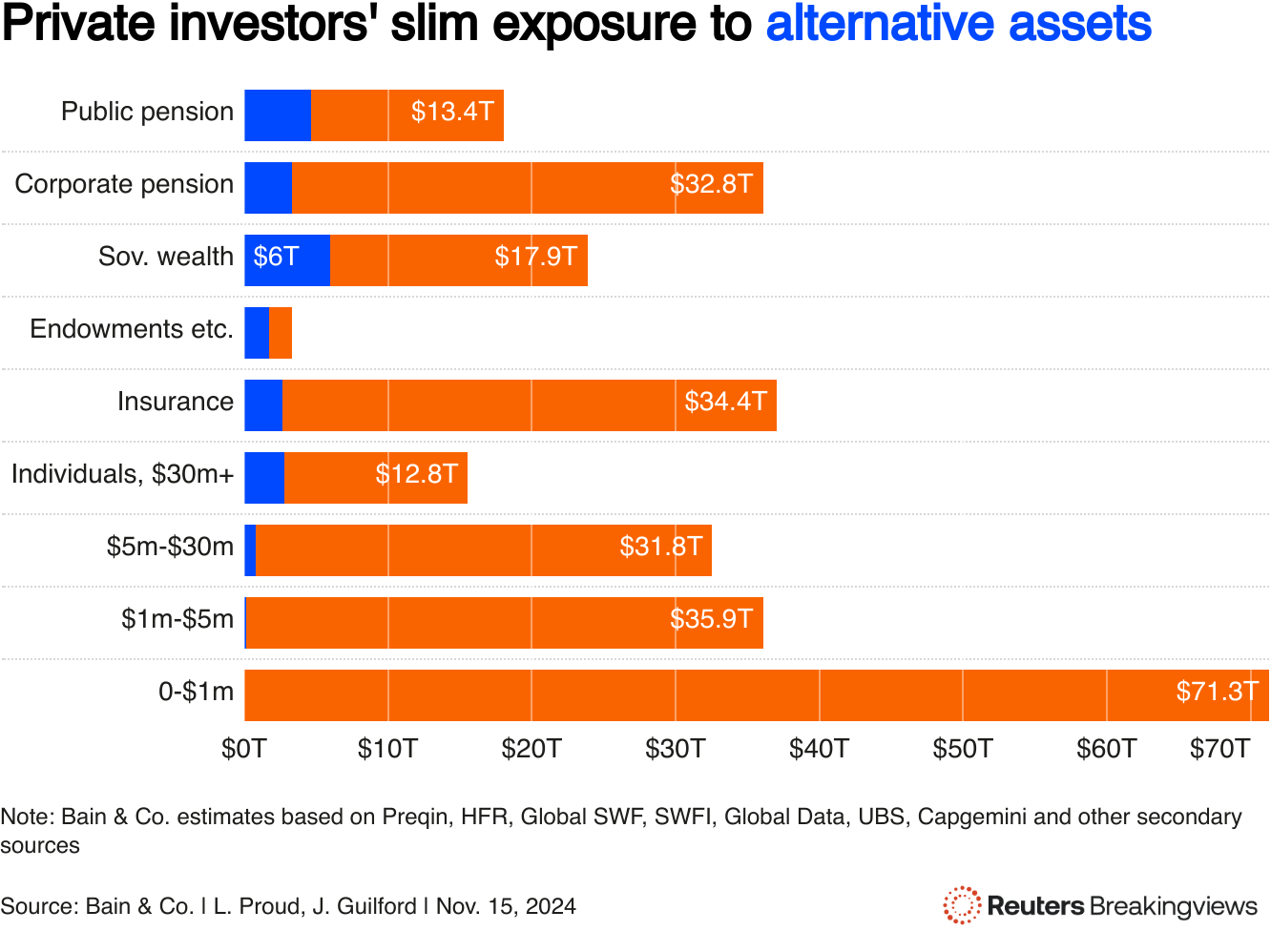 这可能指导黑石对潜在私人财富市场的相对保守估计。它仅包括可投资资金在100万美元或以上的人。这些“高净值个人”根据贝恩公司的分析,约有4.5%的投资在另类资产中,而公共养老金和主权财富基金的比例为四分之一。基本上,黑石正在衡量如果非常富裕的人开始像大型机构一样投资,市场上会有什么可争夺的。