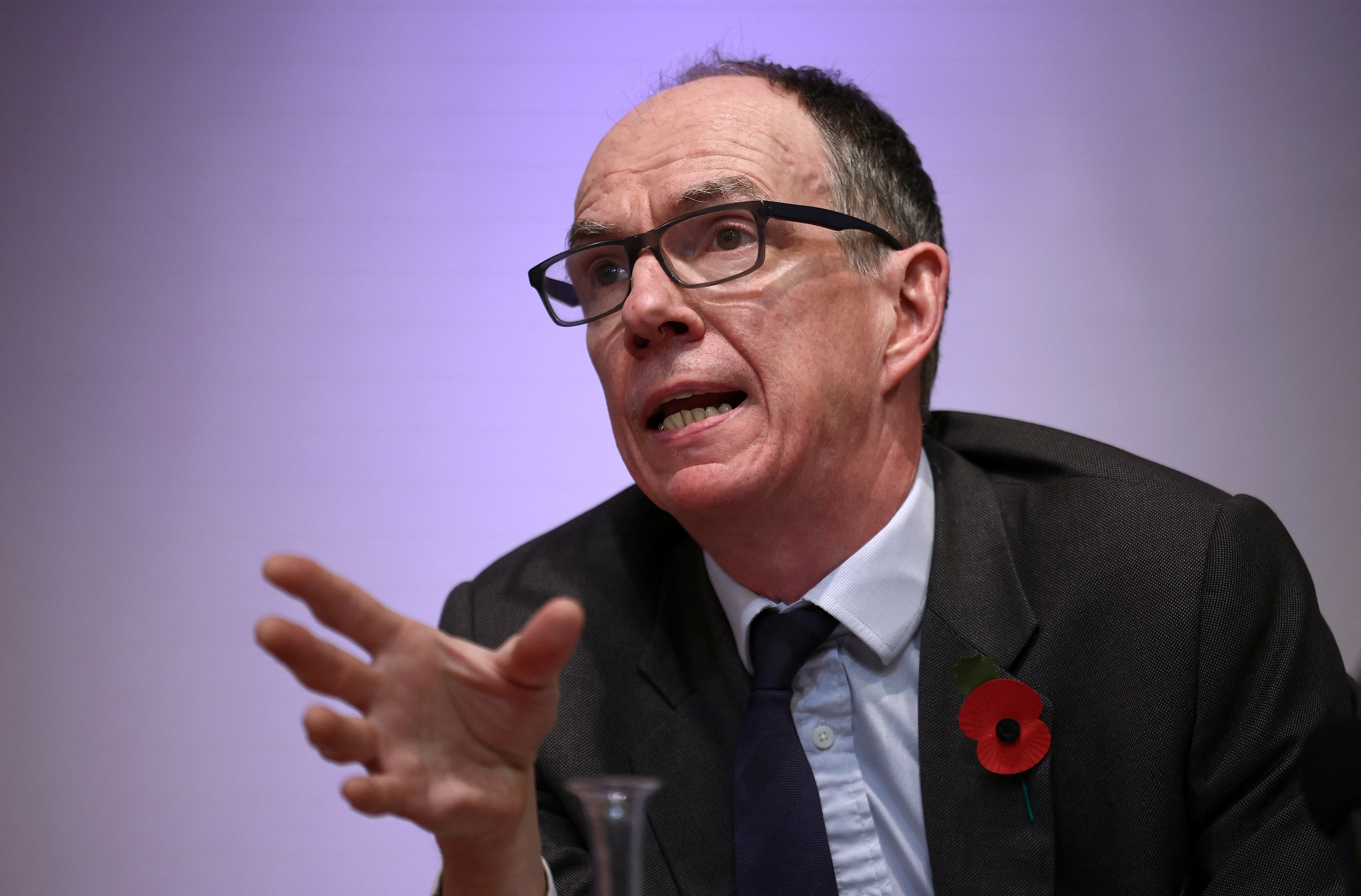 英格兰银行副行长、市场与银行部的戴夫·拉姆斯登在2024年11月7日于伦敦英格兰银行举行的中央银行货币政策报告新闻发布会上发言。 HENRY NICHOLLS/Pool via REUTERS/档案照片伦敦,11月20日(路透社) - 英国通胀至少与英格兰银行最新预测的低于预期一样可能,可能需要更快的降息,副行长戴夫·拉姆斯登周三表示。