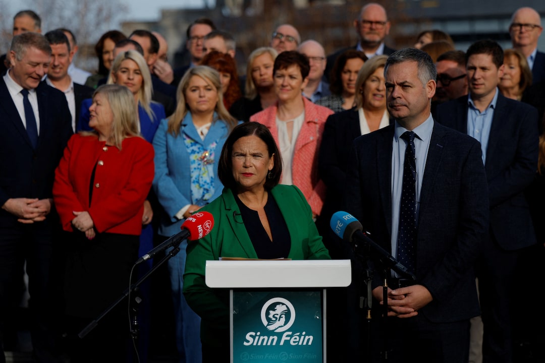 第1项,共6项,辛费因党主席玛丽·卢·麦克唐纳在爱尔兰都柏林举行的候选人发布会上对媒体发表讲话,此次发布会是在宣布举行大选后,时间为2024年11月11日。路透社/克洛达·基尔科因