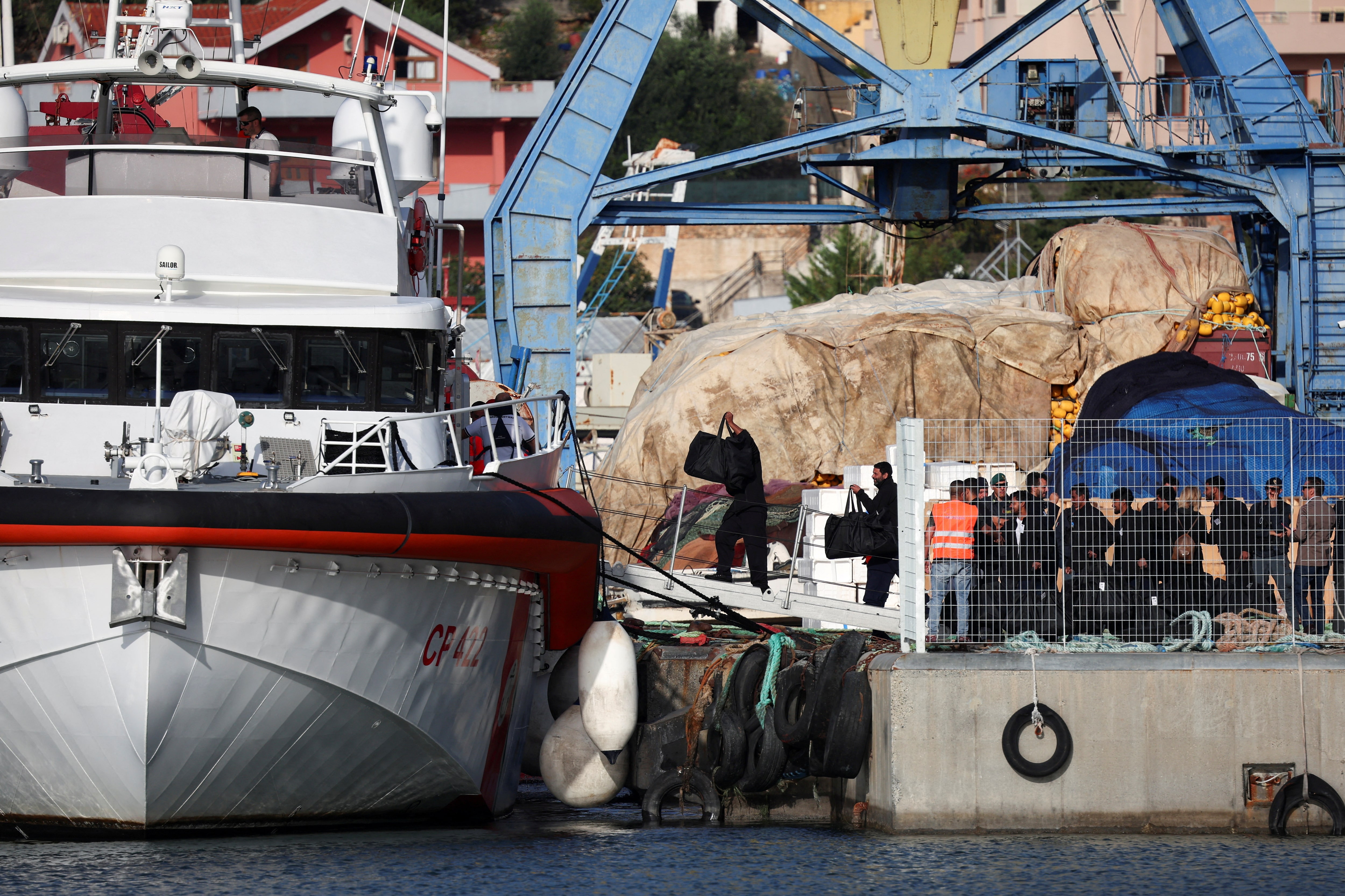 项目 1 共 3 意大利海军舰艇 Libra 载着移民抵达阿尔巴尼亚的无人机视角,这是与意大利达成的一项协议的一部分,旨在处理在意大利水域附近被捕获的数千名寻求庇护者,地点在阿尔巴尼亚的 Shengjin,日期为 2024 年 11 月 8 日。路透社/Florion Goga/档案照片