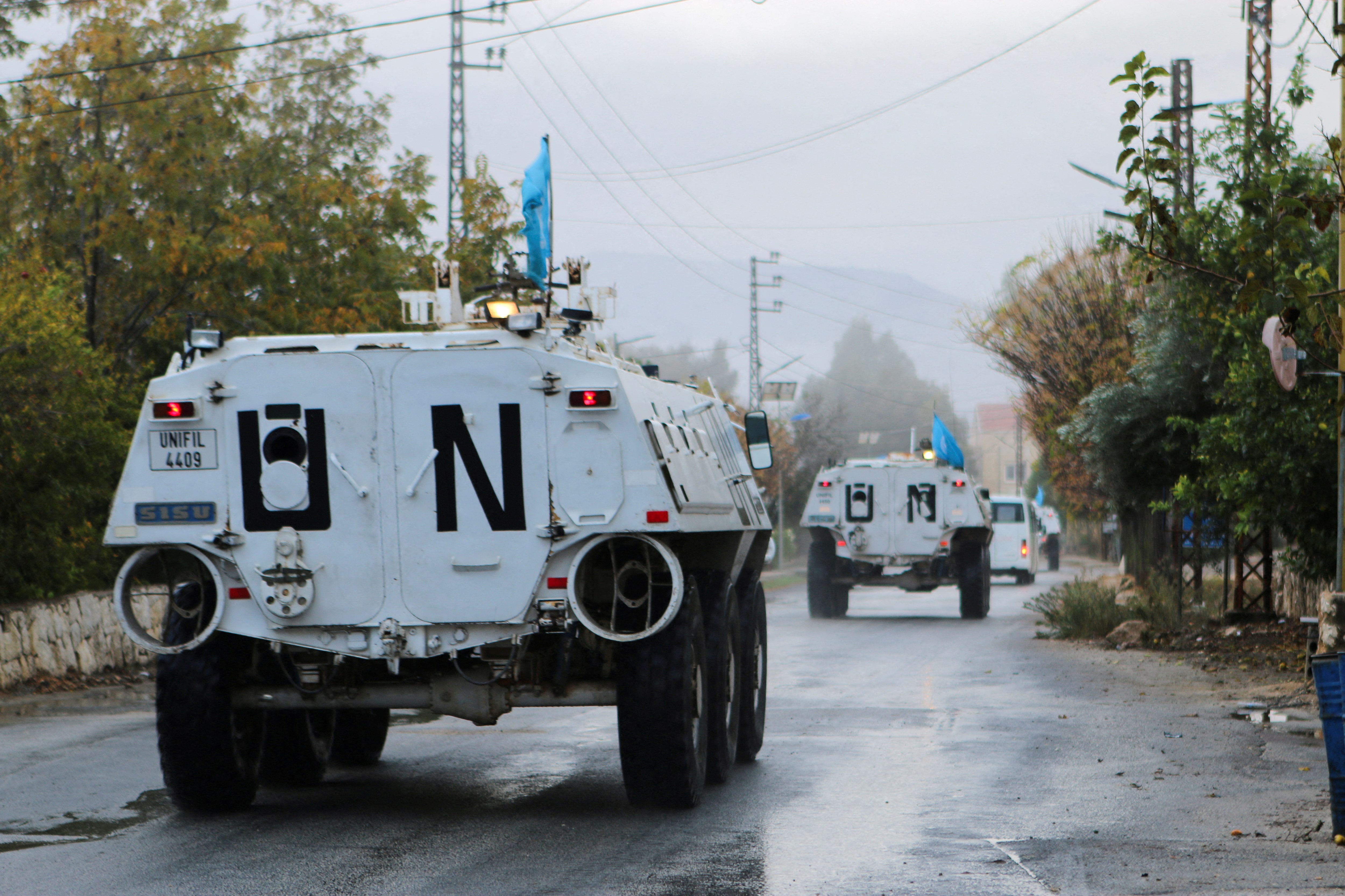 4辆联合国维和部队(UNIFIL)车辆在黎巴嫩南部马尔贾尤恩的街道上行驶,期间以色列军队与真主党之间的敌对行动仍在继续,日期为2024年11月19日。路透社/卡拉马拉·达赫尔/档案照片