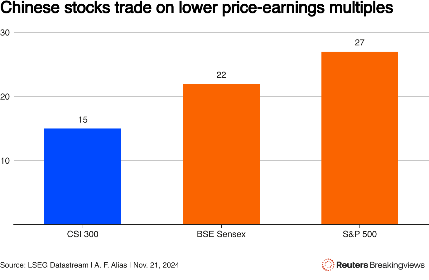最近,中国股票的投资者正在经历他们自己的中国综合症。在过去三年半中,基准CSI 300指数的价值损失了近三分之一,而标准普尔500指数(.SPX)的领先美国股票篮子却飙升至新的历史高点。随着唐纳德·特朗普即将重返白宫,并得到共和党控制的国会的支持,投资者是否应该准备好迎接中国股票进一步萎缩,还是现在是采取逆势观点的时刻?