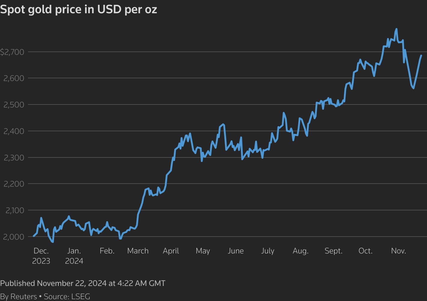 11月22日(路透社) - 黄金价格在周五首次突破2700美元大关,创下两周以来的新高,并有望录得一年多以来的最大周涨幅,因为避险需求抵消了美元的强势以及对下个月美国降息的预期降低。