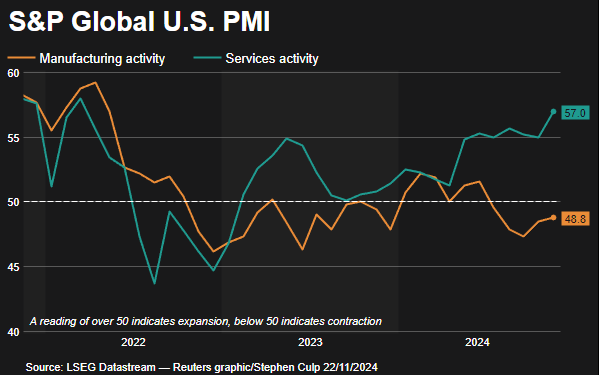 纽约,11月22日(路透社) - 欧元跌至两年低点,美元在PMI数据发布后走强,而比特币再次触及历史最高点,并继续向100,000美元的门槛攀升。