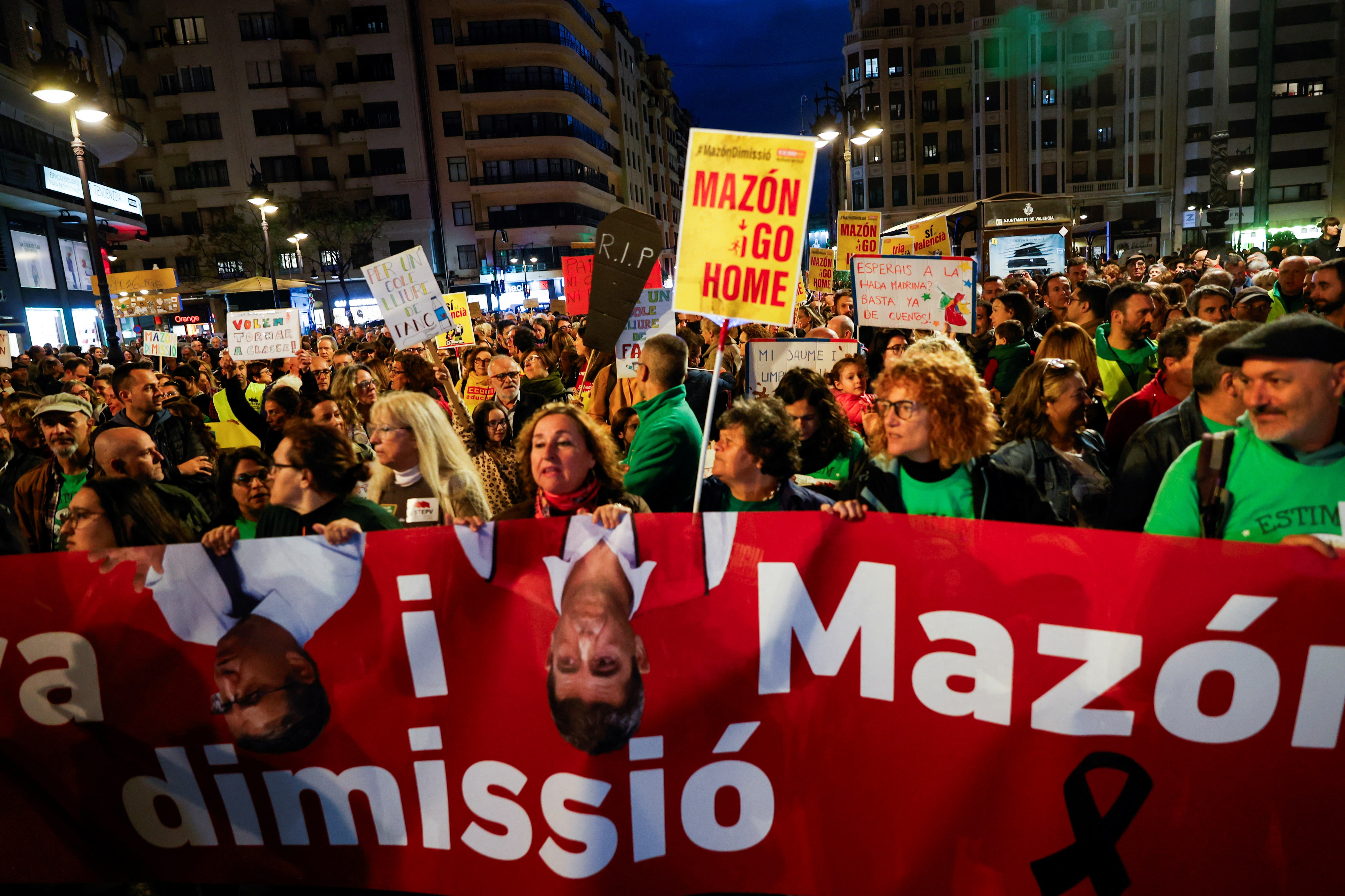 抗议者举着要求瓦伦西亚领导人卡洛斯·马宗辞职的标语,几乎在10月29日该国几十年来最严重自然灾害发生一个月后,游行穿过这座西班牙城市。