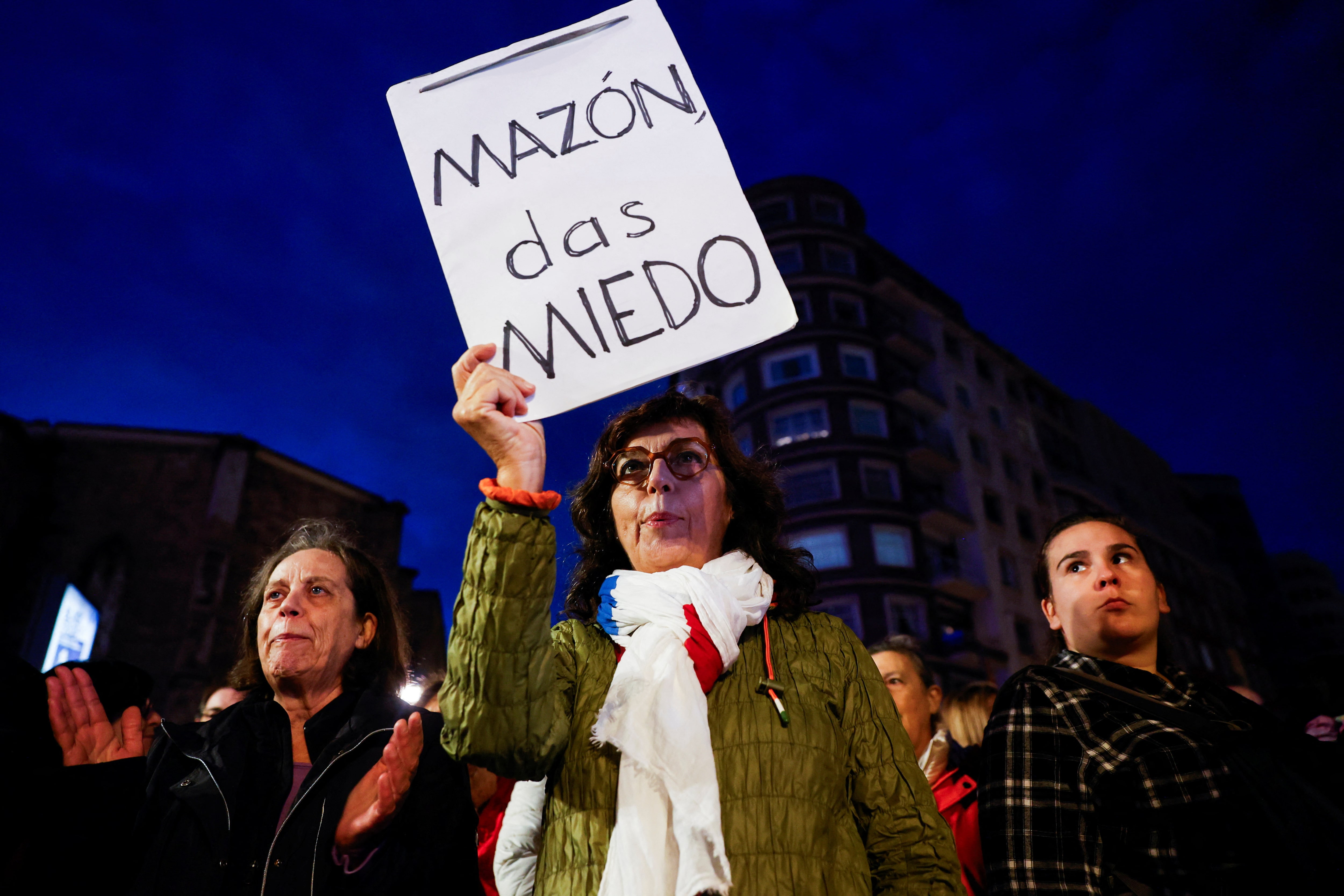 一名女性举着写着“马宗,你真可怕”的标语,工会、教师和家庭在瓦伦西亚抗议东部西班牙洪灾后教育应急响应的管理,2024年11月23日,路透社/埃娃·马内兹西班牙政府表示,大约有5000人参加了示威活动。