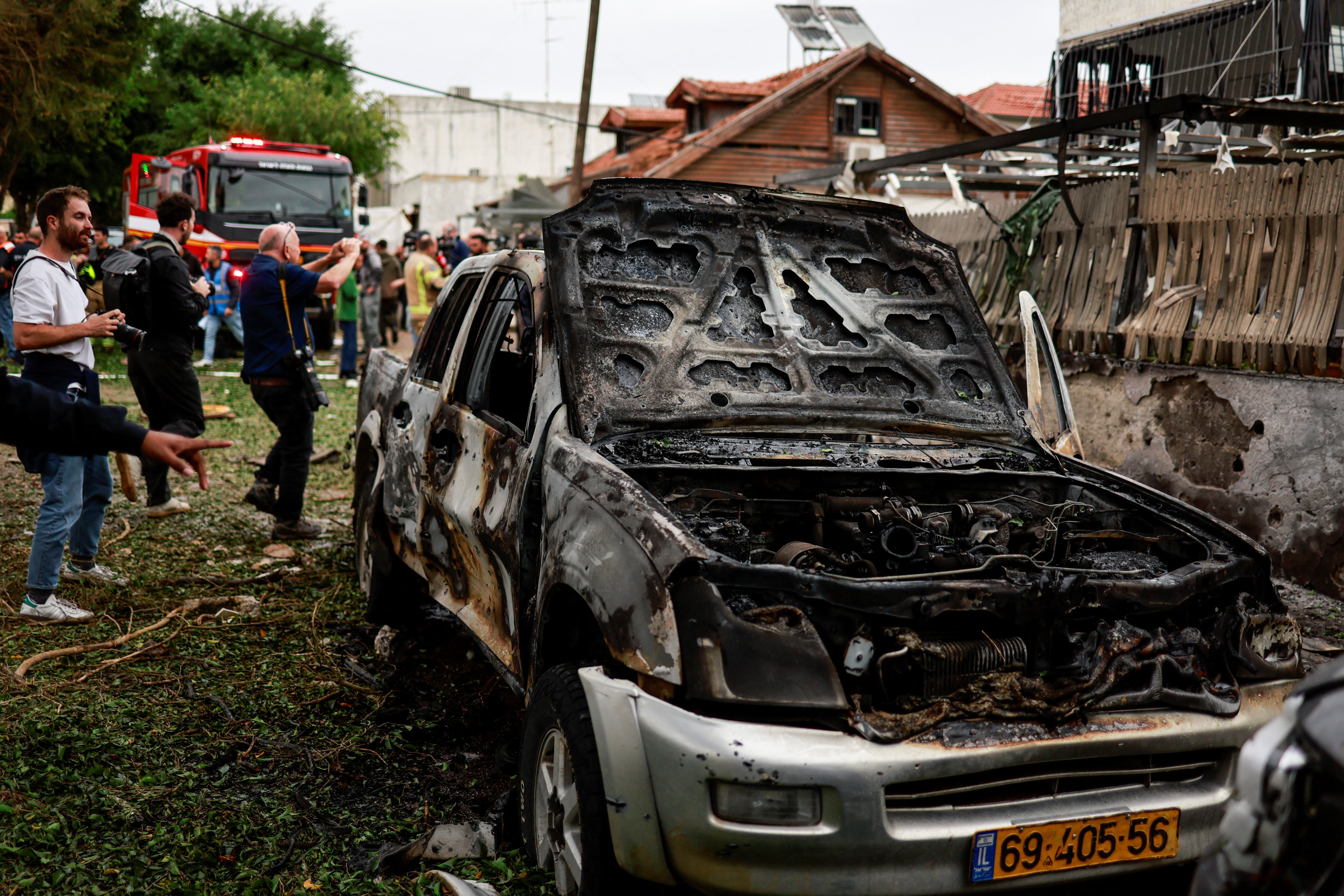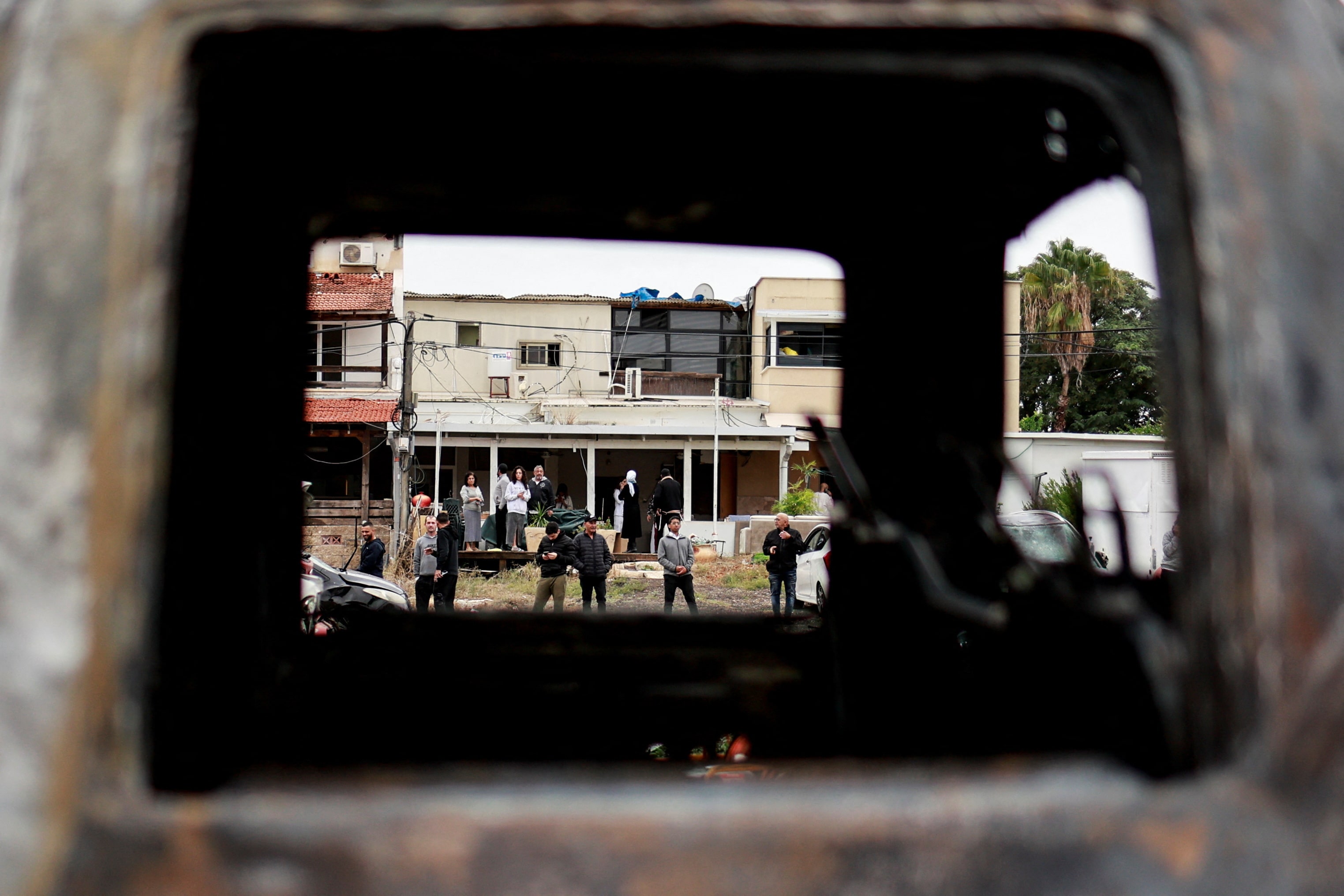 第1项,共4项 人们聚集在一辆被摧毁的车辆旁,那里有一个弹药落下,弹药从黎巴嫩越过边界进入以色列,正值真主党与以色列之间的敌对行动持续进行中,地点在以色列佩塔提克瓦,2024年11月24日。路透社/阿马尔·阿瓦德