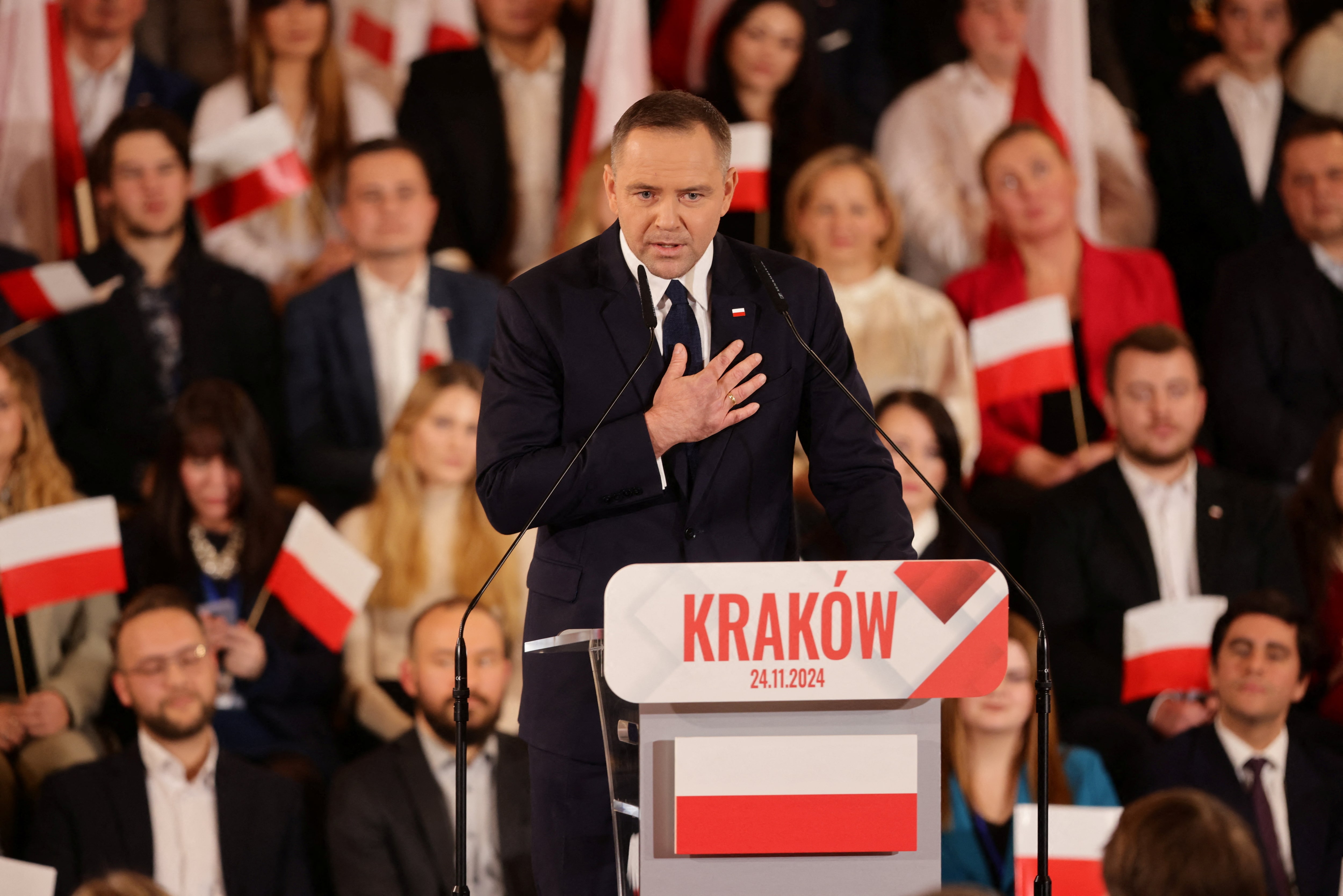 第1项,共5项 历史学家卡罗尔·纳沃尔基被宣布为波兰主要反对党法律与公正党(PiS)在2025年总统选举中的候选人,地点是在波兰克拉科夫的党代会上,时间为2024年11月24日。雅库布·沃德克/选举代理机构.pl/通过路透社