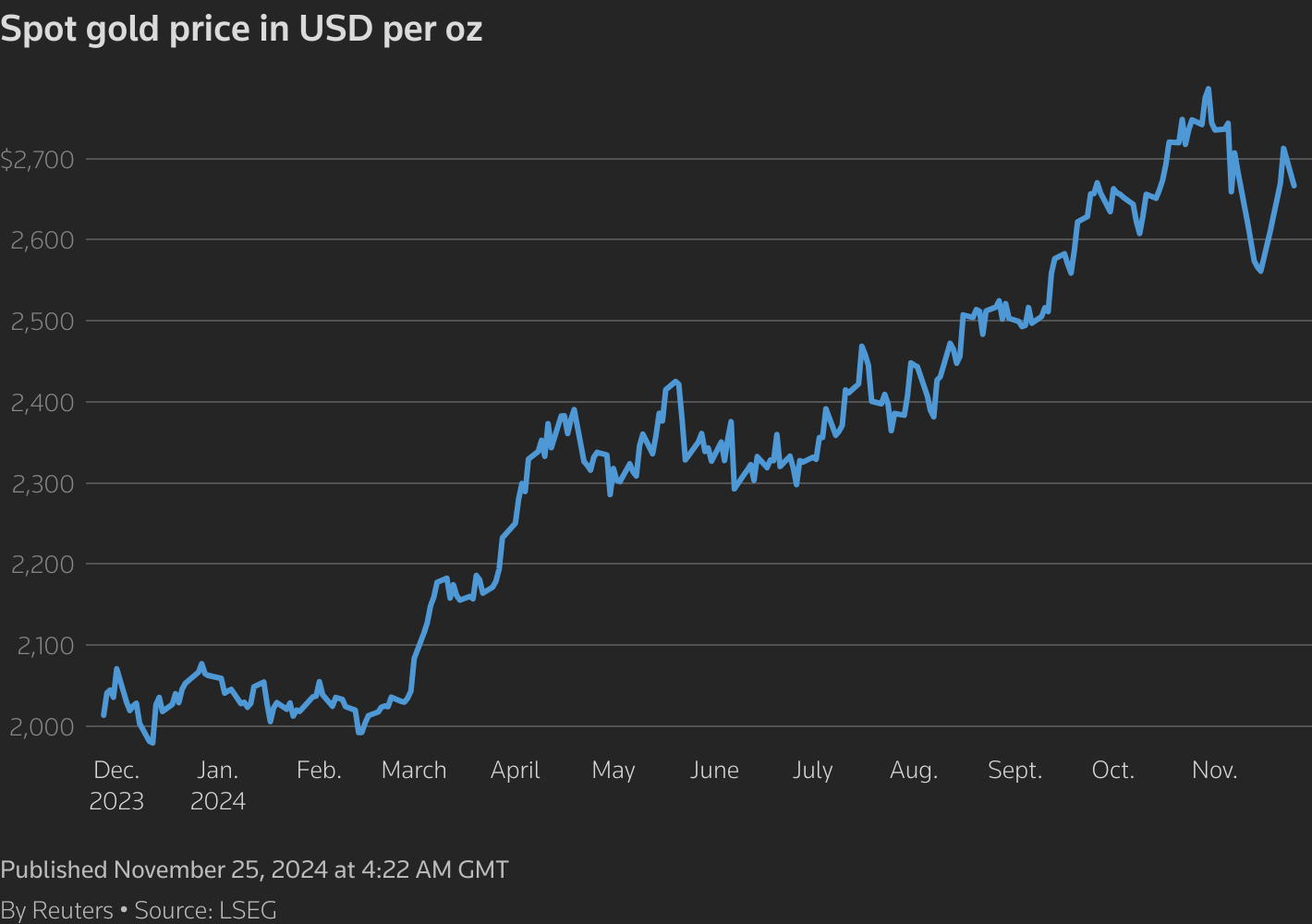11月25日(路透社) - 黄金价格周一下跌近3%,打破了连续五天的上涨,达到三周以来的最高点,因为关于以色列与真主党之间停火的报告以及斯科特·贝森特被提名为美国未来财政部长的消息降低了黄金作为避险资产的吸引力。