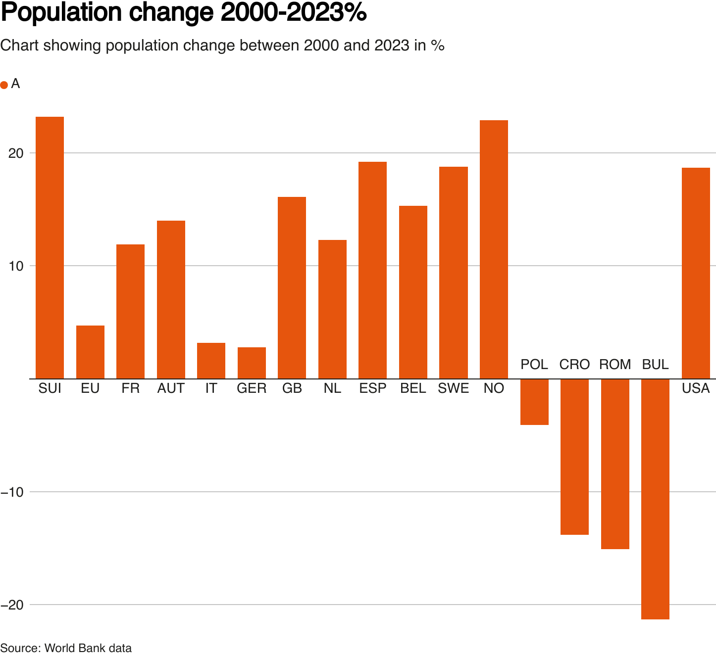 瑞士人口在六十年中增长最快,去年以来的增长率是自1990年代中期以来欧盟的四倍多。