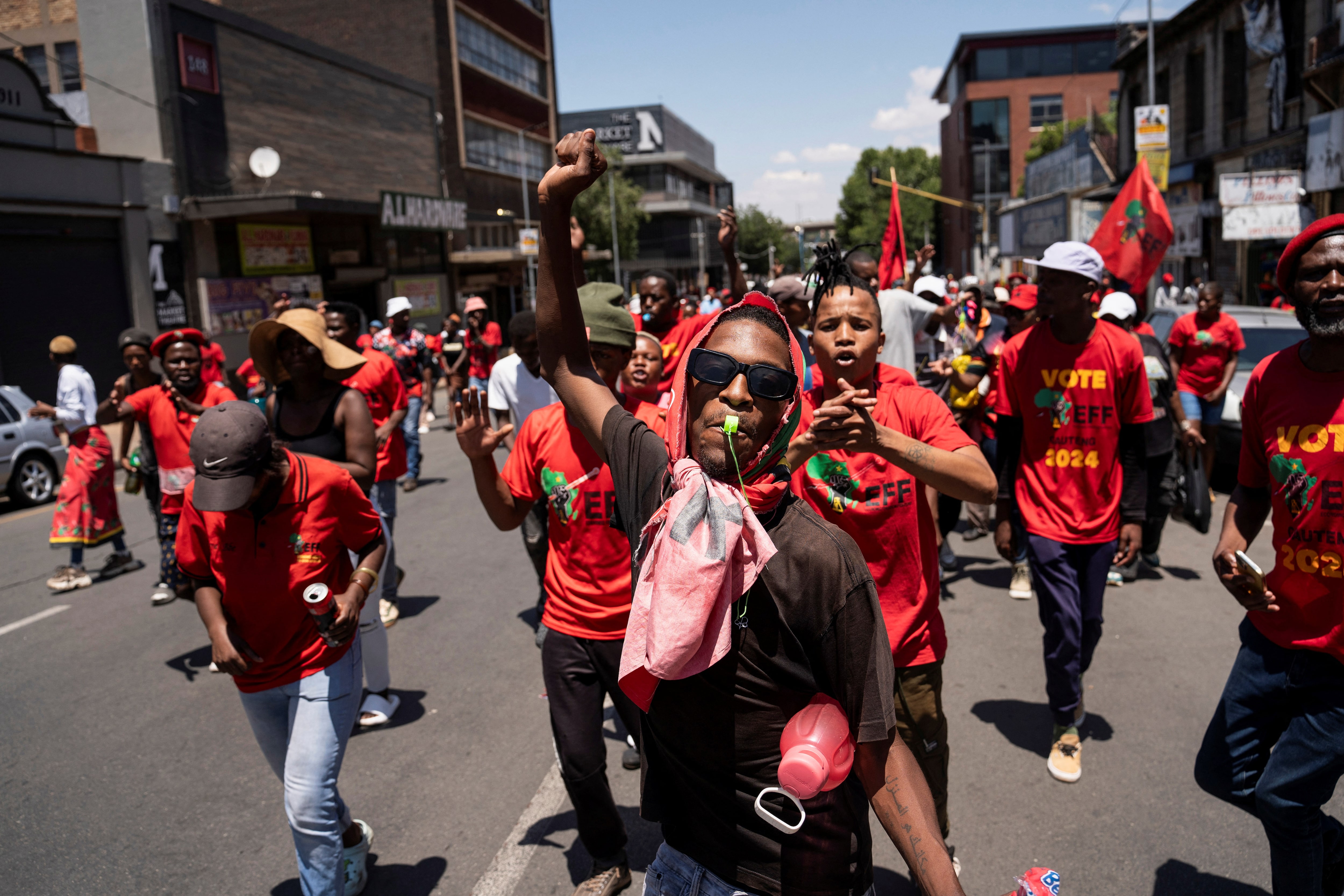 第1项,共6项 经济自由斗士(EFF)的成员在街头抗议,前往宪法法院,该政党正在挑战国民议会对一份报告的拒绝,该报告可能导致对总统西里尔·拉马福萨的弹劾程序,原因是发生在南非约翰内斯堡他私人狩猎场的法拉法拉丑闻,2024年11月26日。路透社/Ihsaan Haffejee