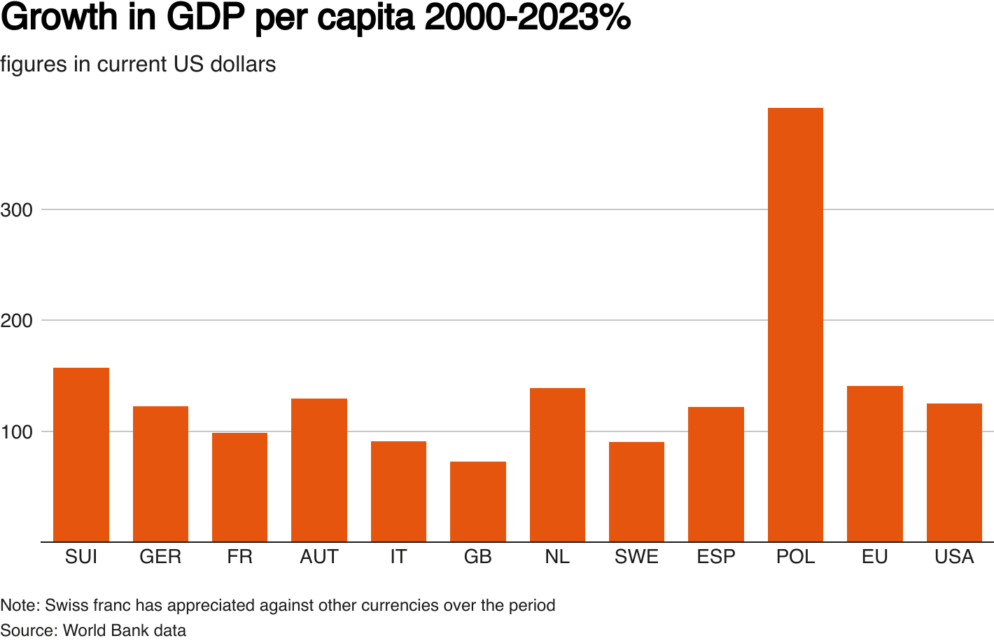 自1999年瑞士获得无限制进入欧盟单一市场以来,其经济增长速度超过了德国、奥地利、法国和意大利等邻国,这些国家在前十年中增长缓慢。就业增长更快,平均工资也有所上升。