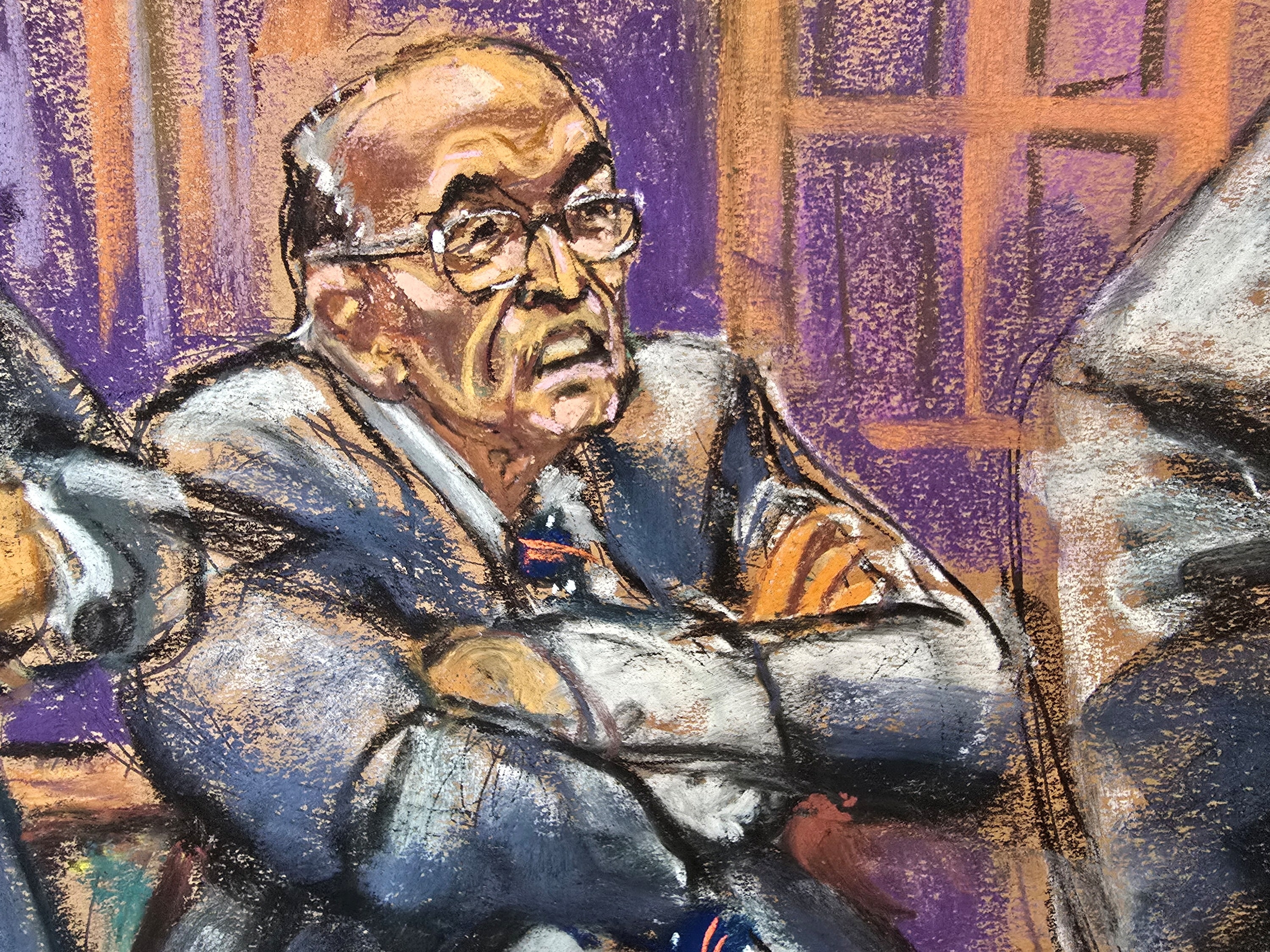 第1项,共3项 鲁迪·朱利安尼在纽约市的法庭听证会上手势表达,涉及他对两名乔治亚州选举工作人员的财产移交案,他被发现对他们进行了诽谤,这幅法庭素描由路透社的简·罗森伯格绘制。